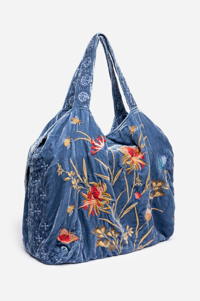 Experimenting with color and texture, the Aria Velvet Tote revamps a simple silhouette into a new seasonal must-have. A functional staple for daily pursuits, this tote is made from soft silk blend velvet and features two top handles, a shoulder strap, an inside pocket, and an intricate placement embroidery made up of fresh flowers. Style this tote with everything from denim to neutral linens.