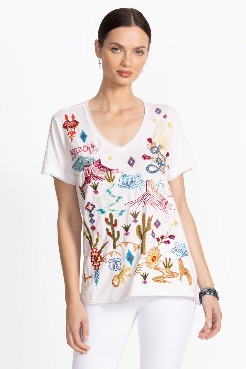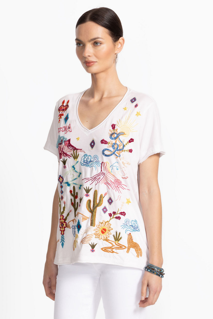 Embracing the spirit of the Grand Canyon state, the Arizona Cap Sleeve Tee honors adventure and individualism at the heart of every traveler. Made of 100% breathable cotton this tee features placement embroidery reminiscent of desert landscapes and Arizona's natural wonders. Team with shorts and sneakers for a casual weekend outing.