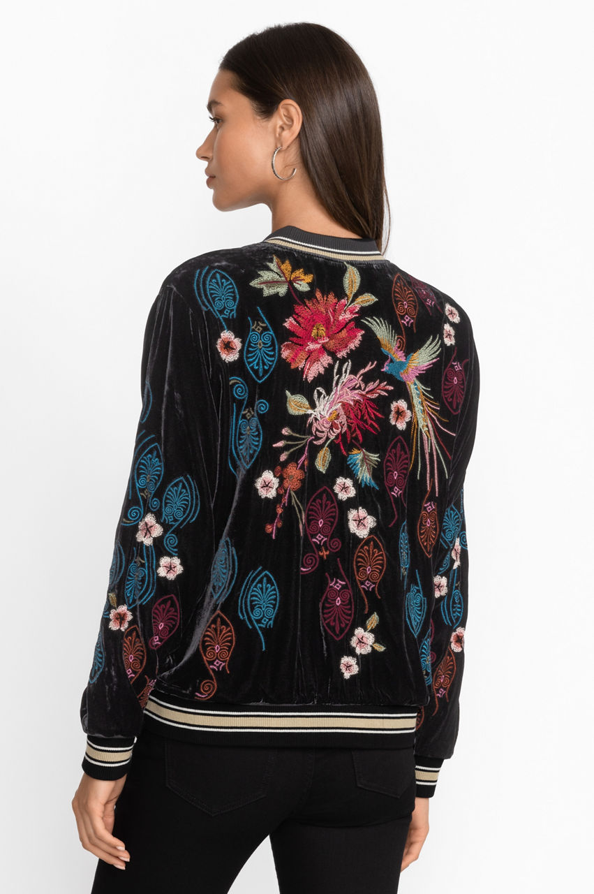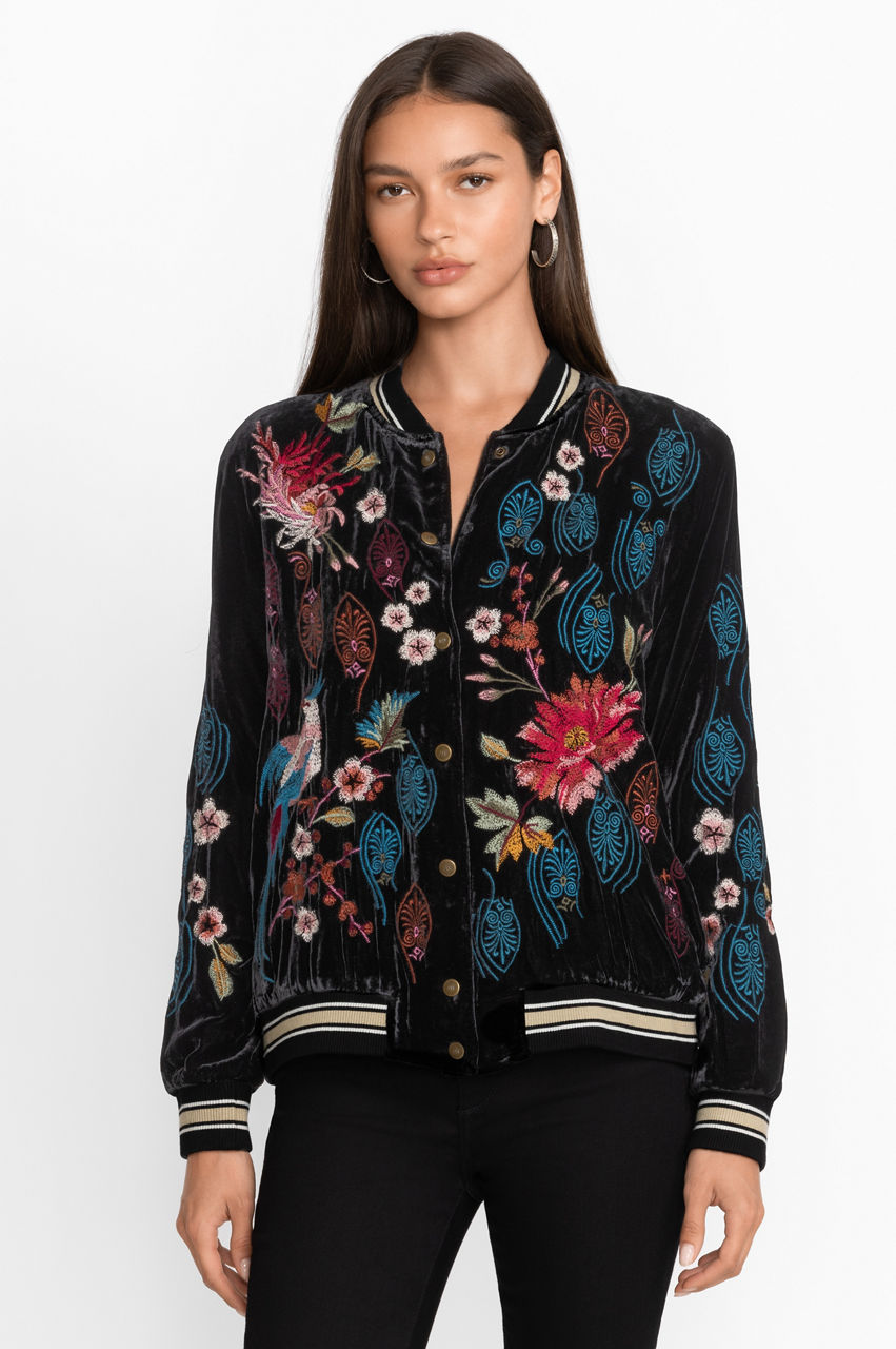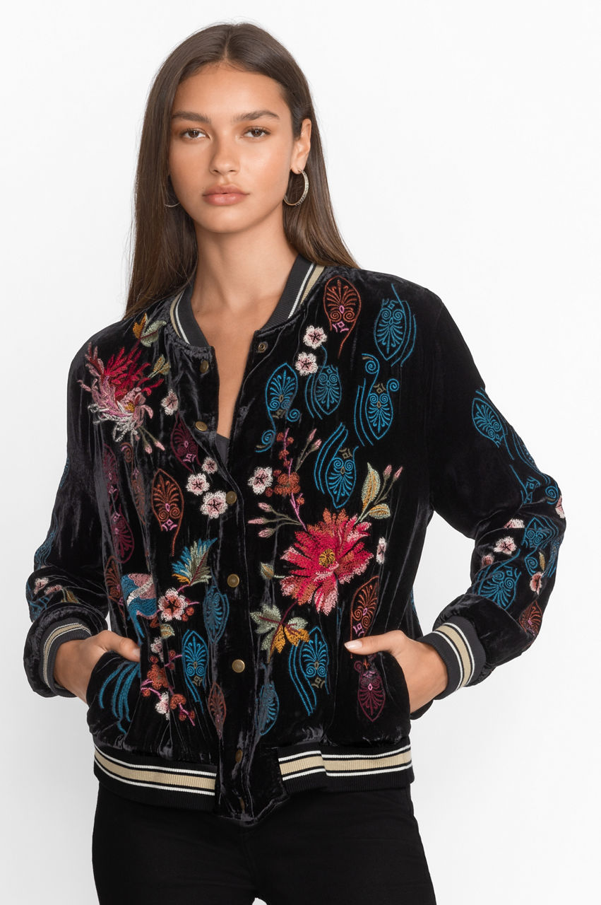 Offering a fresh new take on a traditional masculine wardrobe piece, the Ashira Velvet Snap Front Bomber Jacket is not your father's jacket. Thoughtfully crafted from a rich silk blend fabric this stylish jacket features colorful placement embroidery and a banded hem for a sporty flair. Layer over a crisp tee and relaxed fit denim for an elevated casual style.
