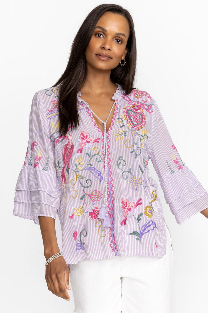 Conjuring up images of rolling hills dotted with vibrant flowers, the Ashlee Ruffle Sleeve Blouse transports you to another place. Beautifully embroidered details and delicate ruffles create a romantic vision that can easily elevate your wardrobe. Pair this blouse with denim trousers or a sleek skirt for a style that transcends.
