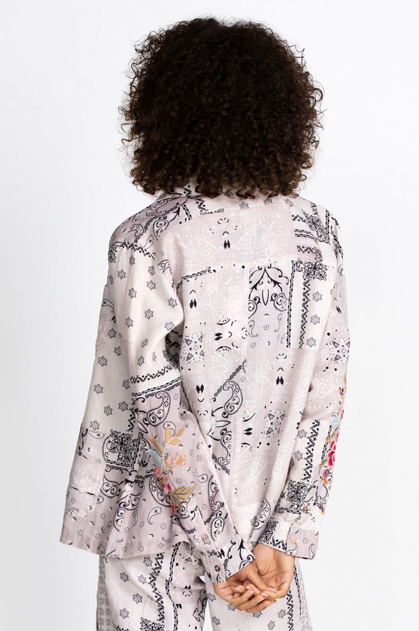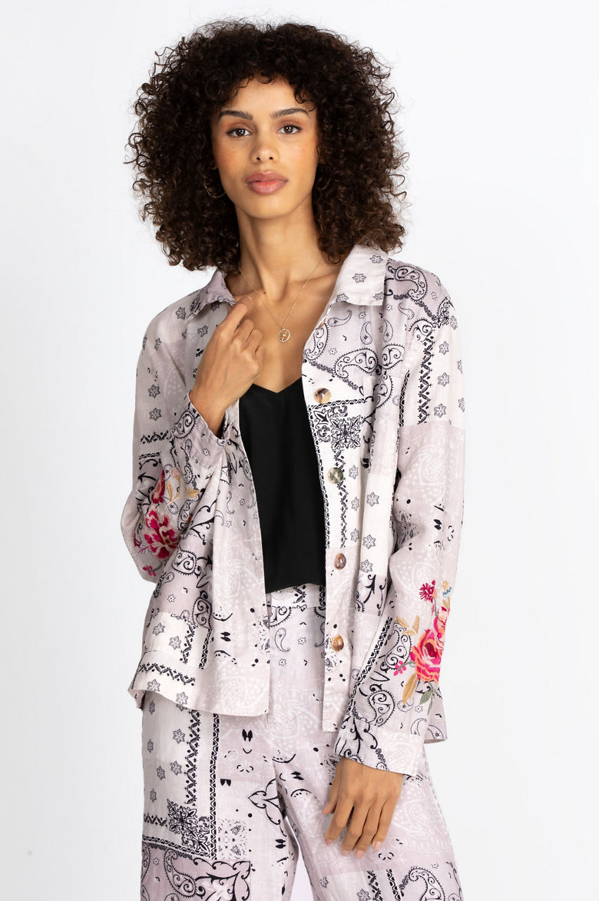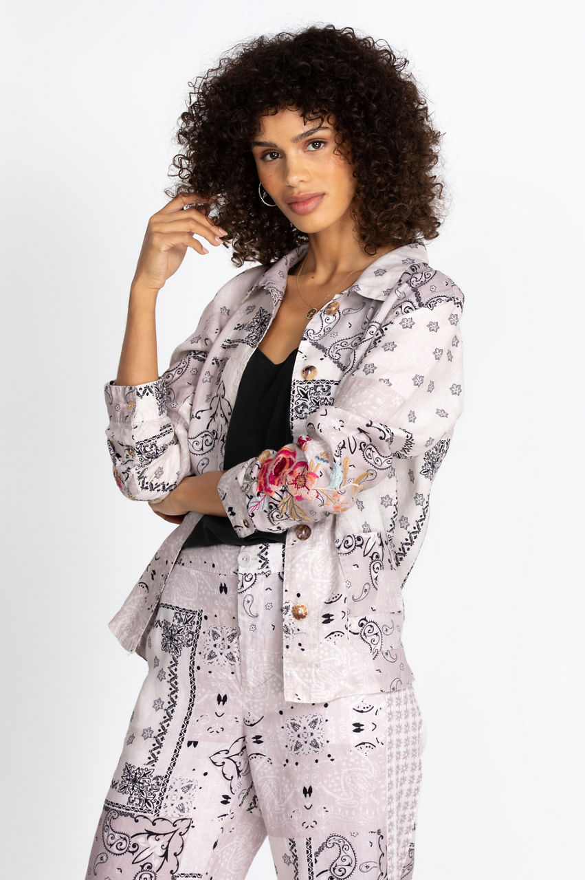 Our chic Ashton Bandana Worker Jacket has gorgeous artisan embroidery on the sleeves for classic boho-chic detailing. The stunning jacket sleeves effortlessly add to the timeless classic form of this multi-pocketed worker jacket. Pair the jacket with tunics, favorite skinny jeans, or a linen dress for a trendy boho style.