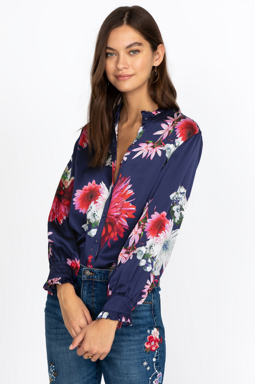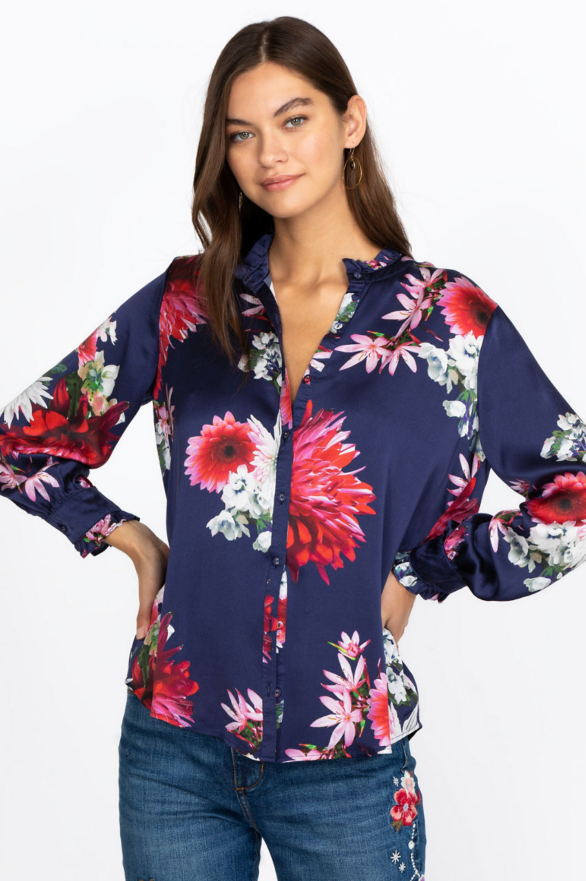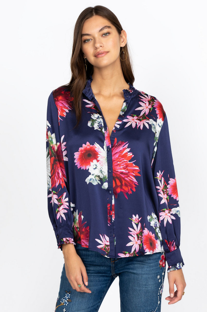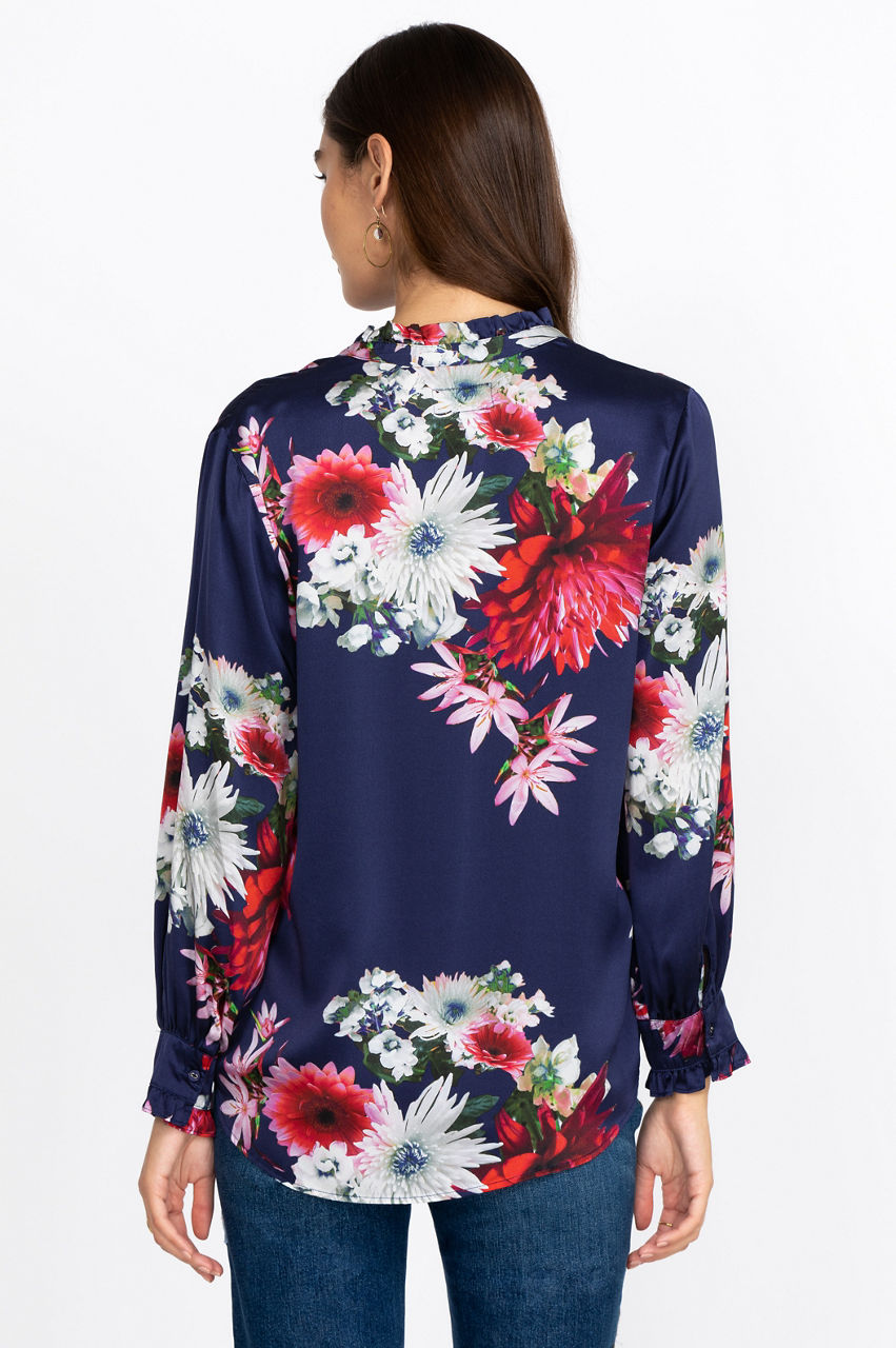 This chic blouse will make a great addition to your wardrobe with its elegant cut and ruffle collar detail. The smooth silk material elevates this blouse to the rank of fashion must-have, while the ruffle collar adds an original detail. Add a statement pendant to complete the look, and pair this delicate top with some black slacks.