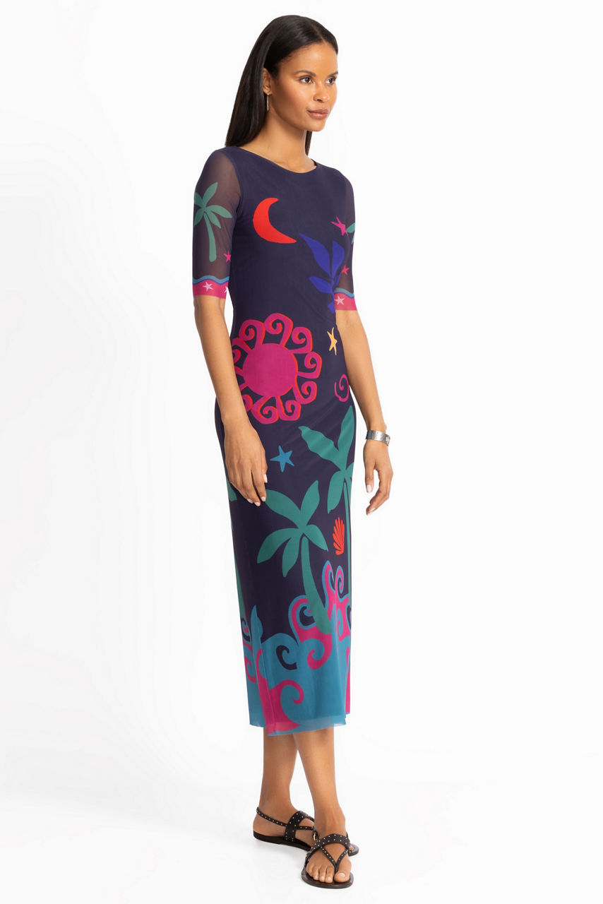 The Astrid Mesh Midi Dress is embellished with bold color and a vibrant scenic pattern with a refreshing island motif. Crafted from a lightweight mesh with a hint of stretch, this midi dress features a rounded neckline and elbow length sleeves and is finished with a lining at the front and back of the bodice. Pair with delicate jewelry and colorful flats for an evening out.