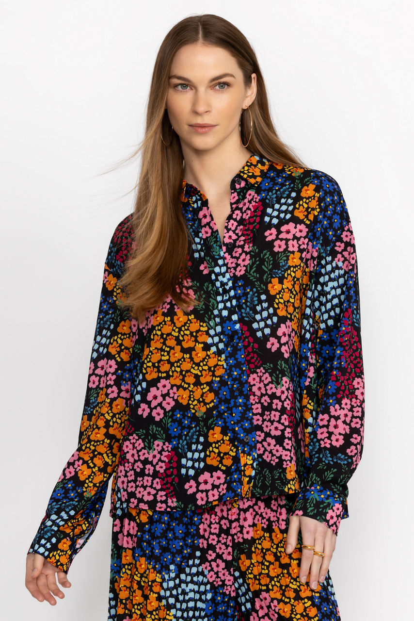 Offering a fresh take on traditional shirting, the Astrid Pleated Blouse combines brilliant floral bouquets with a classic silhouette. Featuring a timeless collared button-front, this easy blouse is adorned with bold florals on a rich backdrop. Pair with a modern structured blazer and linen trousers for a polished work ensemble.