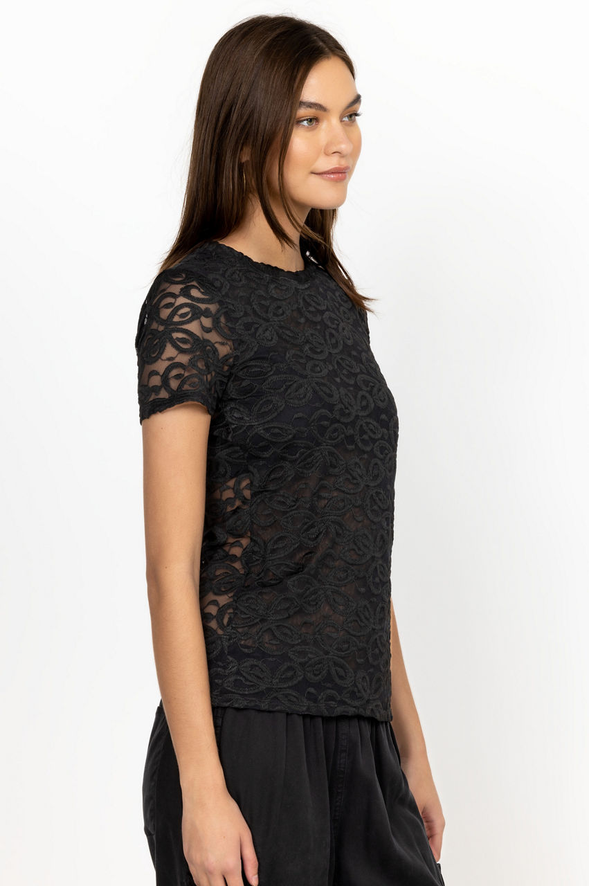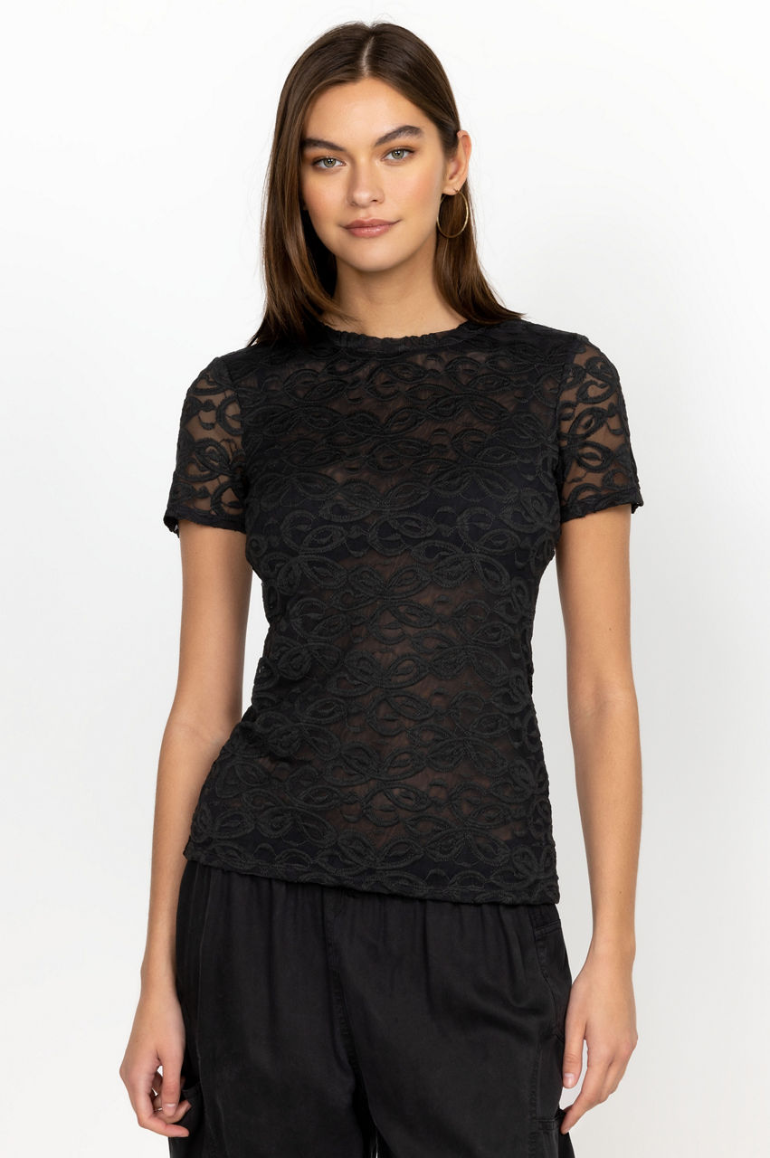 Contemporary with timeless appeal, the Astrid Mesh Top reinvents a versatile silhouette with a statement-making pattern. Cut in a close fit, this top is made from a lightweight mesh material with a hint of stretch for comfort and features a round neck, short sleeves, and an experimental motif in subtle tones. Wear with cropped pants for an effortless take on modern style.