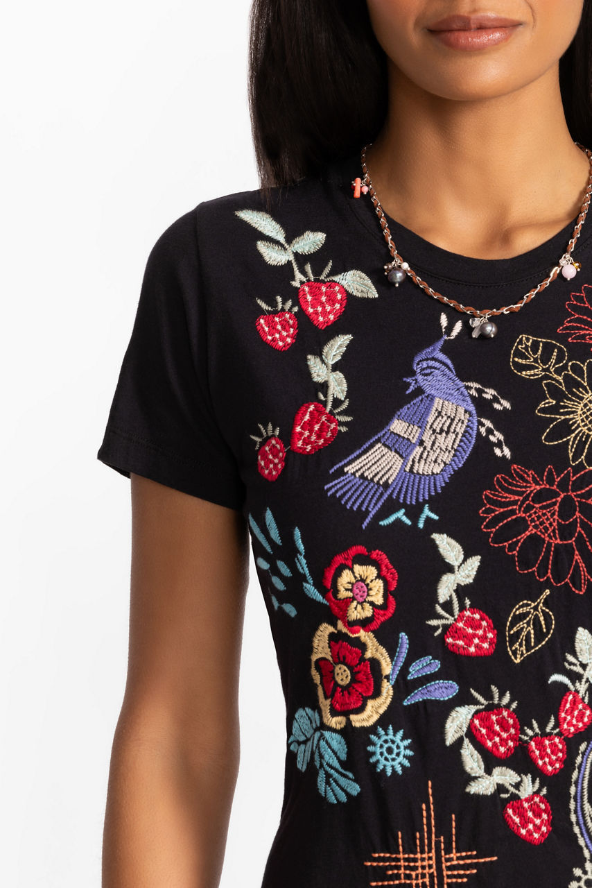 The Asymmetric Ruffle Flounce Short Sleeve Dress is crafted from rich 100% cotton for a light airy hand feel. Beautifully embellished with bold placement embroidery, this dress features a crew neckline and short sleeves and is finished with a distinctive asymmetrical hemline enhanced with ruffled detailing. Pair with strappy heels and a coordinating clutch for an evening out.