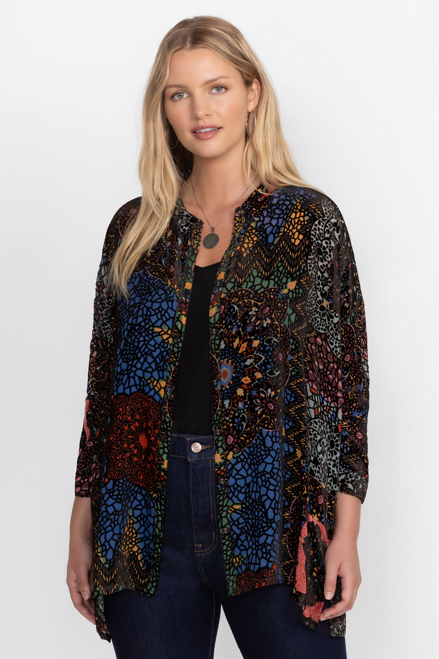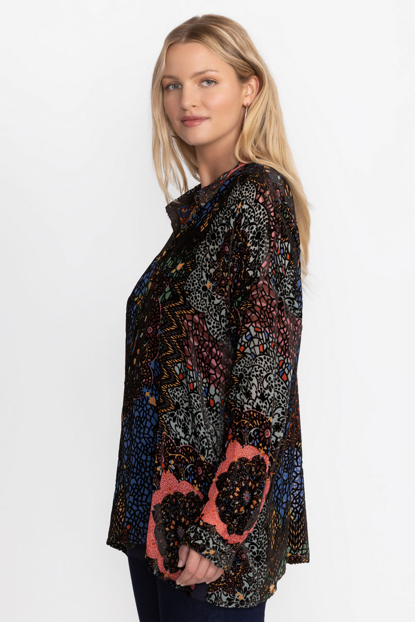 Crafted from a light and airy silk blend, the Audrey Oversized Burnout Shirt is embellished with a vibrant patchwork pattern. Featuring a collared button front and a drop shoulder sleeve, this relaxed-fit shirt is finished with side slits. Pair with fitted pants and leather flats for a polished casual ensemble.