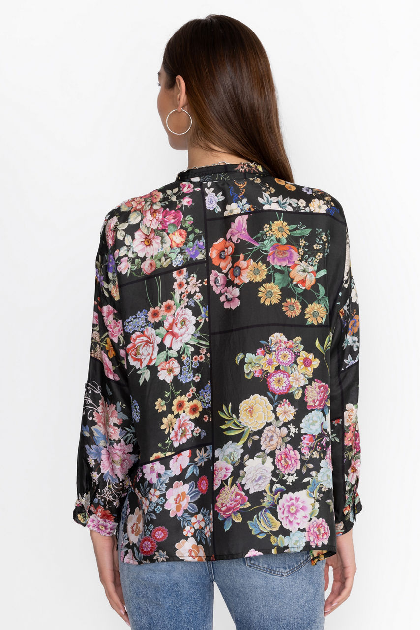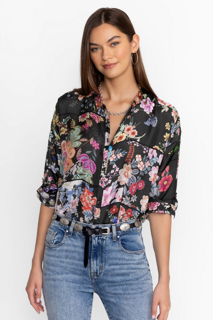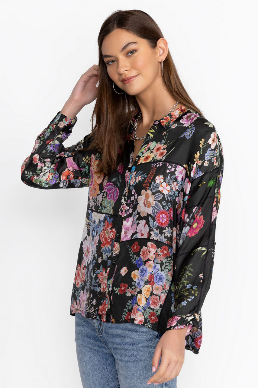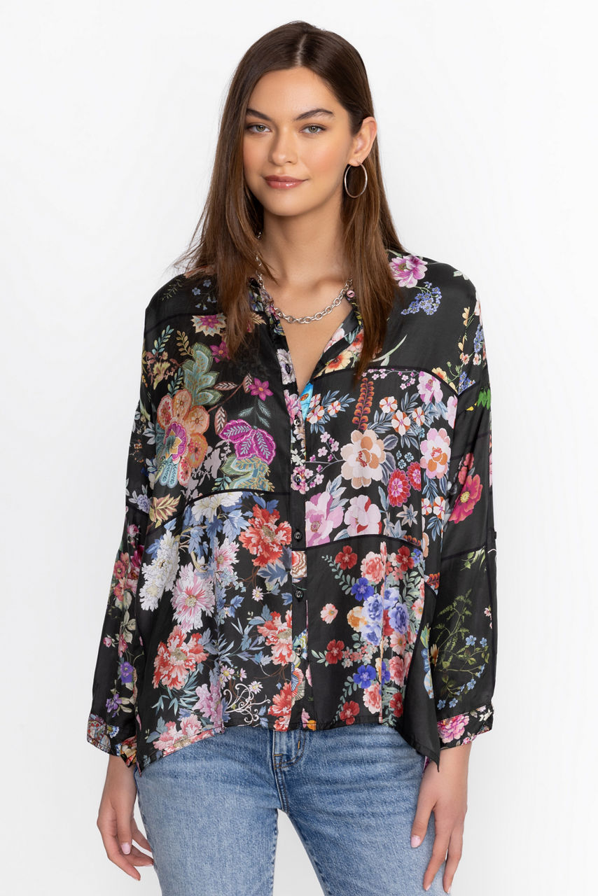 Adorned with a patchwork of brilliant blooms, the Audrey Oversized Button Down offers an elevated casual look. Crafted from 100% silk, this elegant top features a classic button front with drop tab sleeves and a flowing relaxed fit. Pair with linen palazzo pants and leather sandals for a refined casual ensemble.