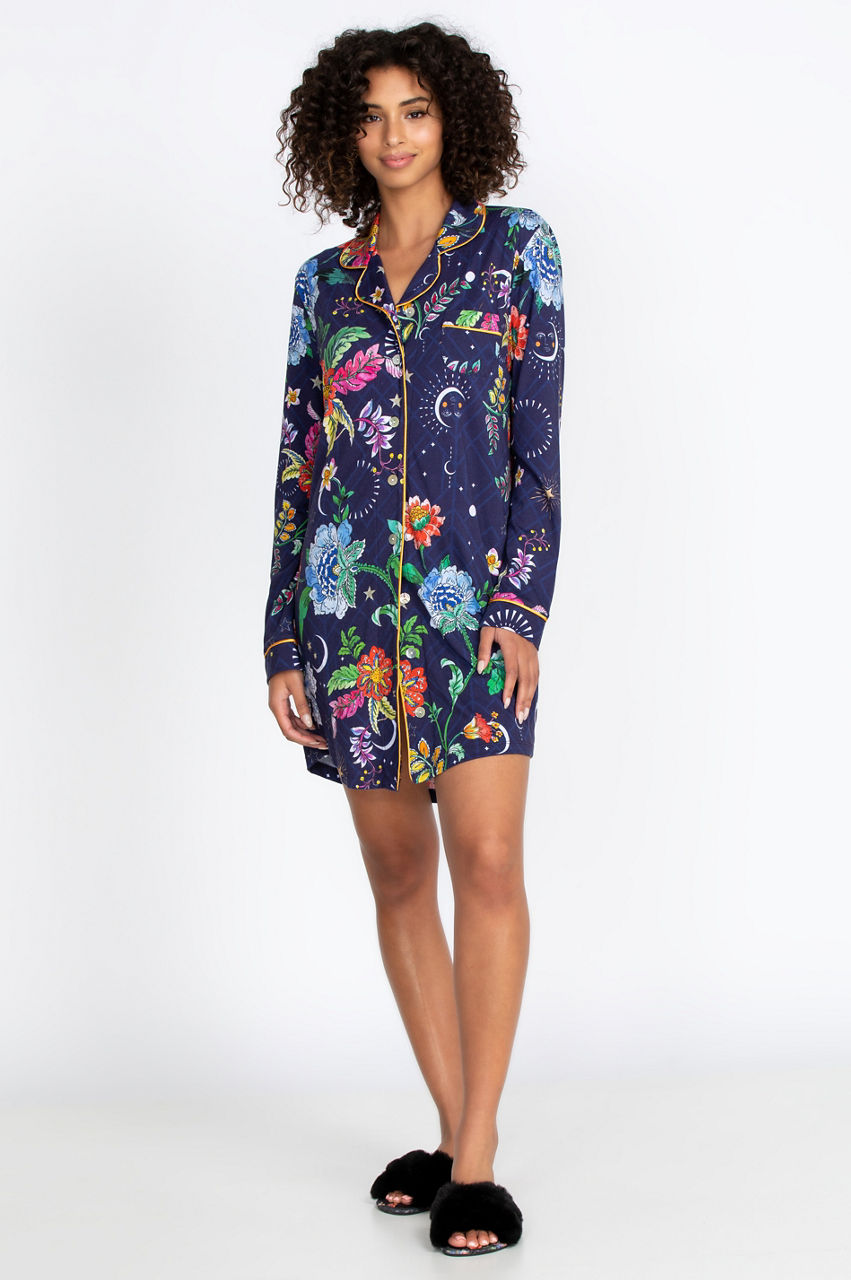 This long-sleeve shirt is ideal for lounging or sleeping with its soft cotton blend, loose fit, and convenient front closure. For an elegant result, the original print combines flowers with motifs inspired by the night sky. You can wear this soft shirt with your favorite joggers for lounging or combine it with some comfortable leggings.