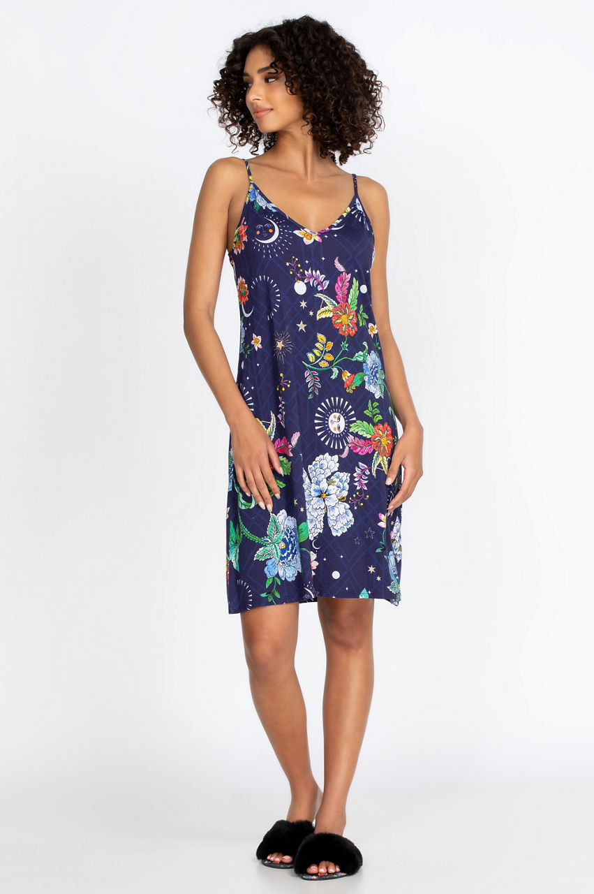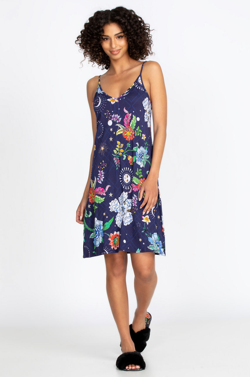Classy and comfortable, this sleep dress combines the delicate feminine style of a tank top with the softness of a nightshirt. The gorgeous print uses a dark fabric to create contrast with colorful floral motifs and other elements inspired by the night sky. Wear this dress by itself for sleeping, or layer it with a comfortable hoodie or cardigan for lounging.