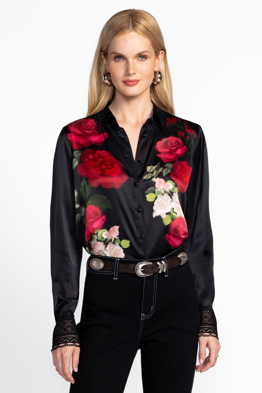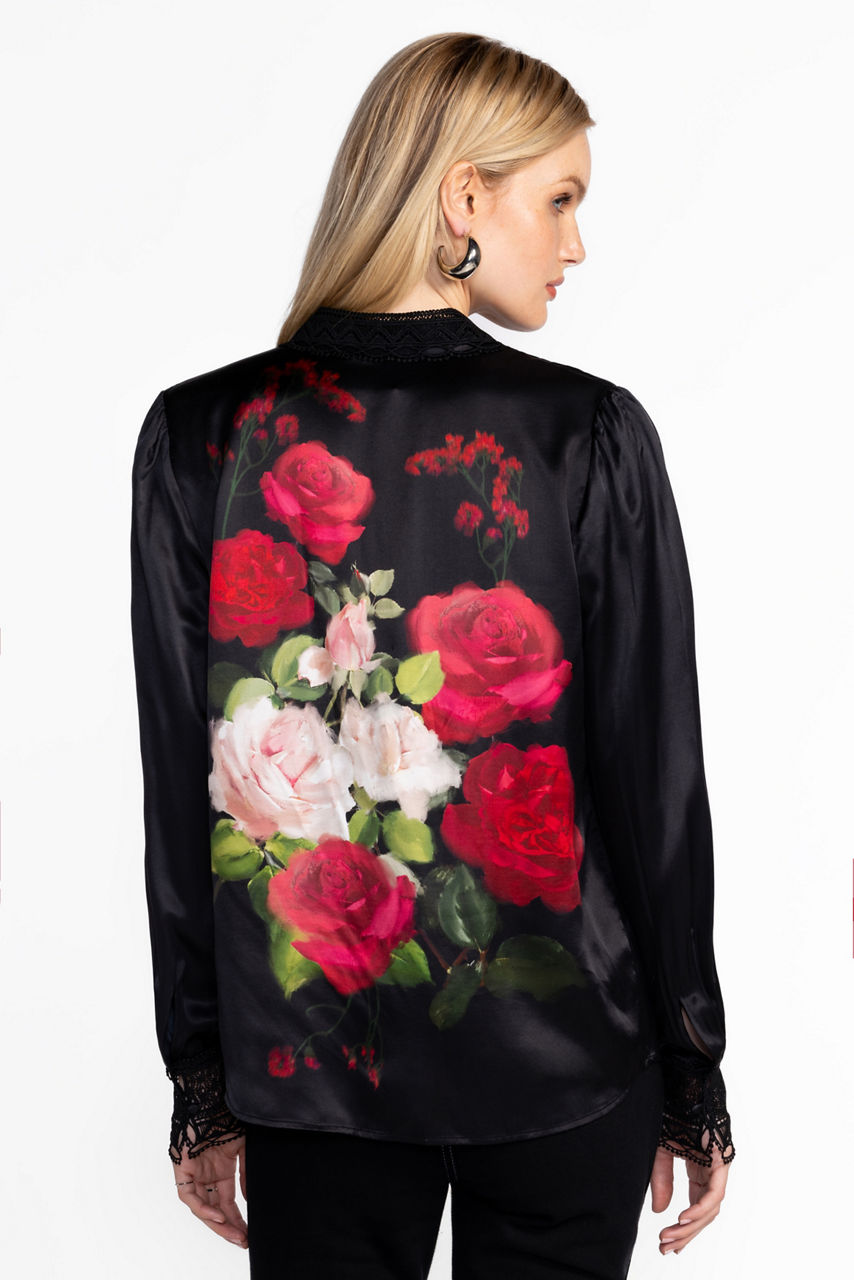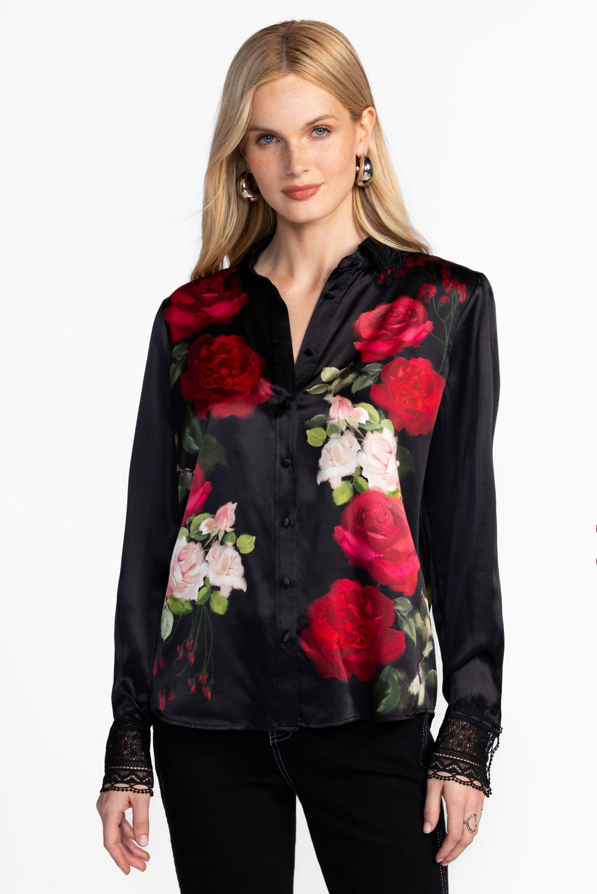 Crafted from a flowing silk blend, the Averi Button Down Blouse is adorned with vibrant floral blooms. Featuring a collared button front with decorative gathers at the shoulder seams, this unique blouse is finished with delicate lace accents at the cuffs and collar. Pair with wide-leg pants and bold pumps for a polished evening look.