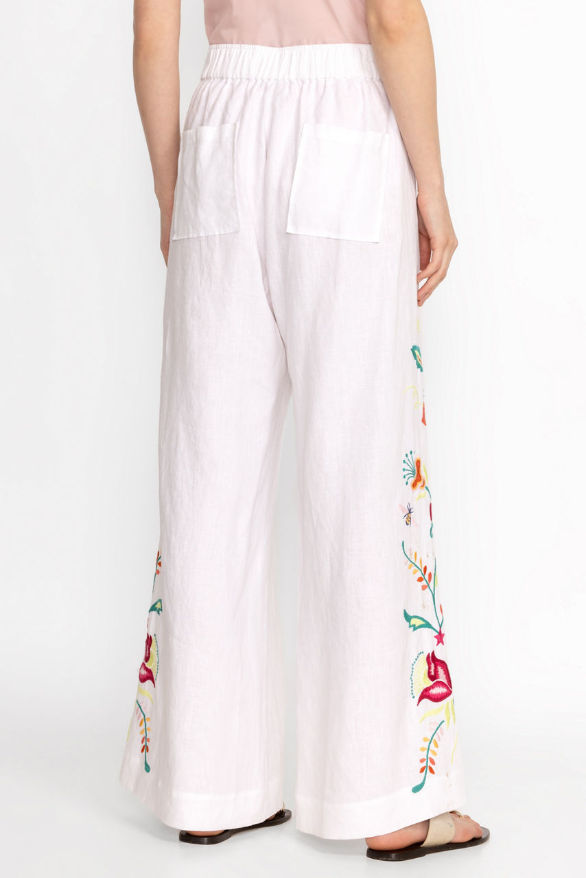 Crafted from 100% breathable linen, the Averi Wide Leg Linen Pants perfectly combine style and wearability. Featuring a pull-on waist and patch pockets at the back, these lightweight pants are expertly detailed with vibrant placement embroidery for a bold splash of color. Pair with classic linen button-down and add a bold sun hat for a hint of drama.