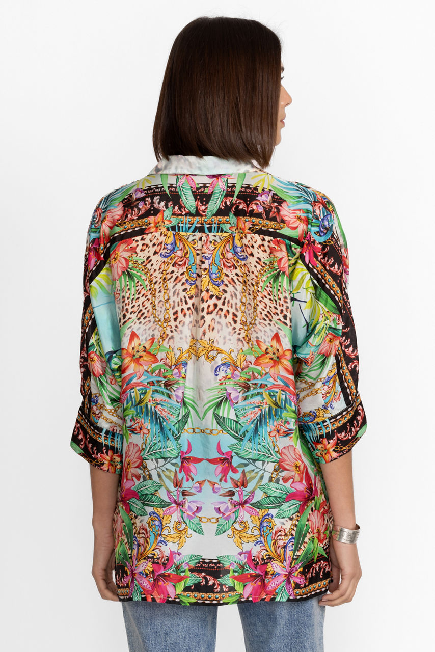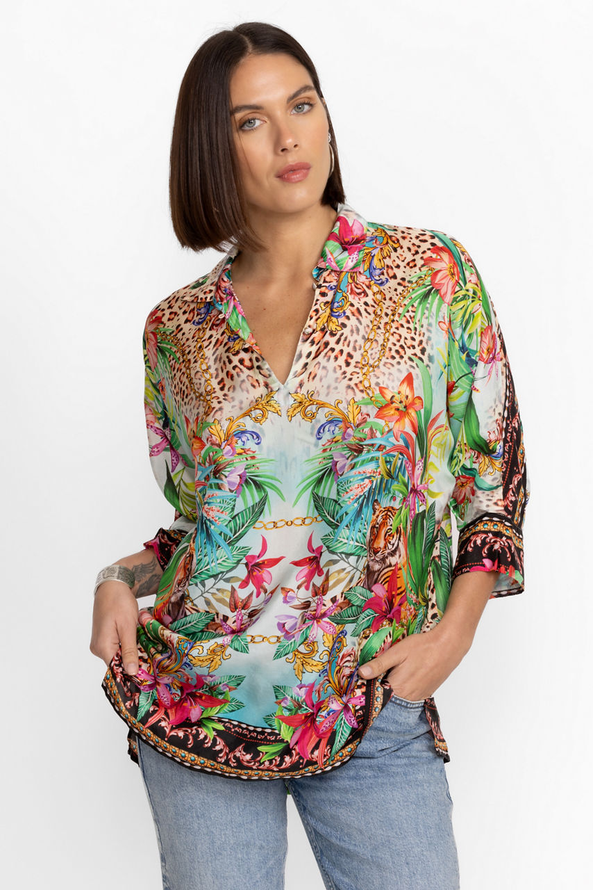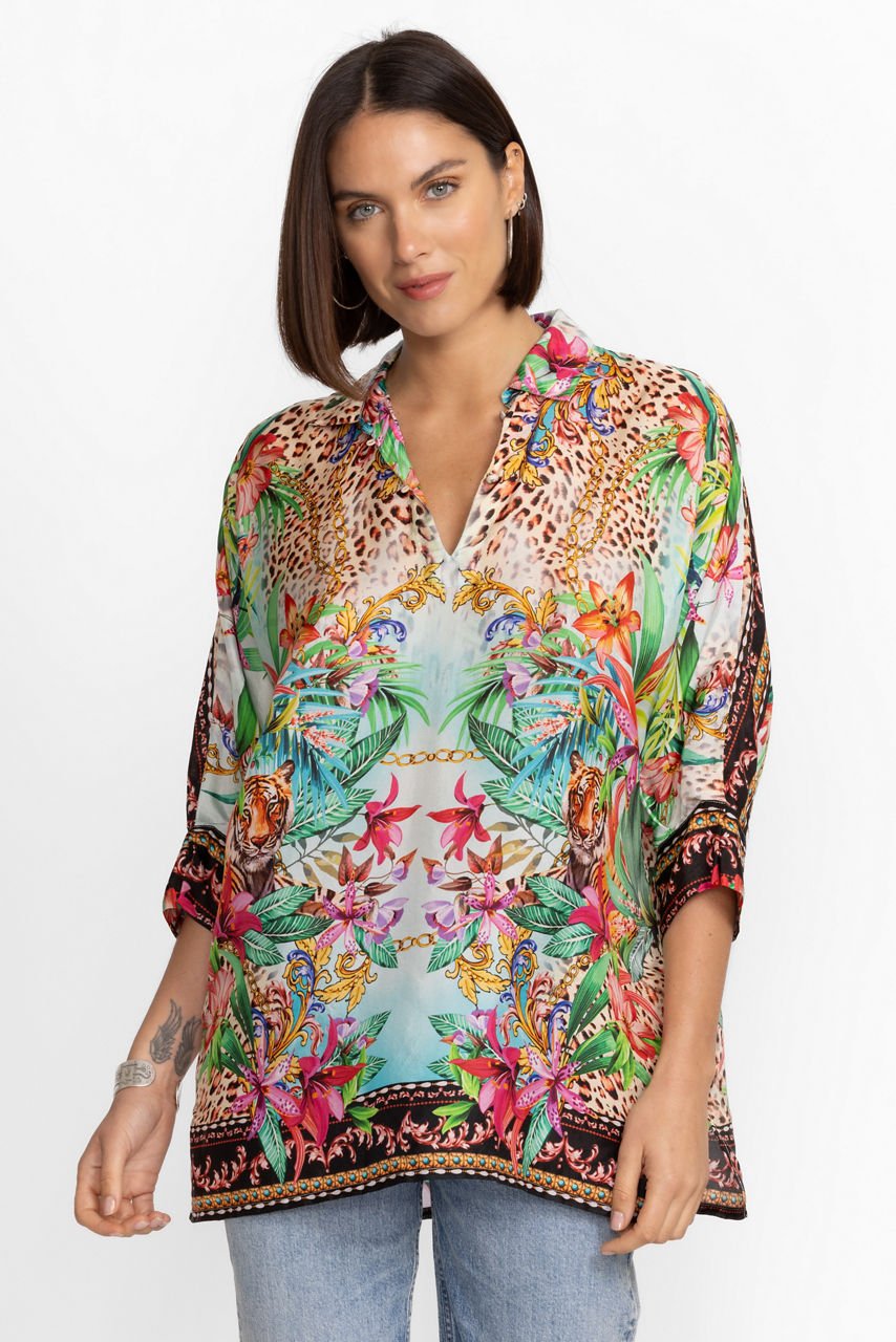 Crafted from 100% silk, the Aviina Tunic perfectly combines style and comfort. Adorned with a vibrant multicolored graphic, this piece features dolman sleeves, a keyhole closure and buttons down the front. Pair with dark leggings or denim for a polished look.