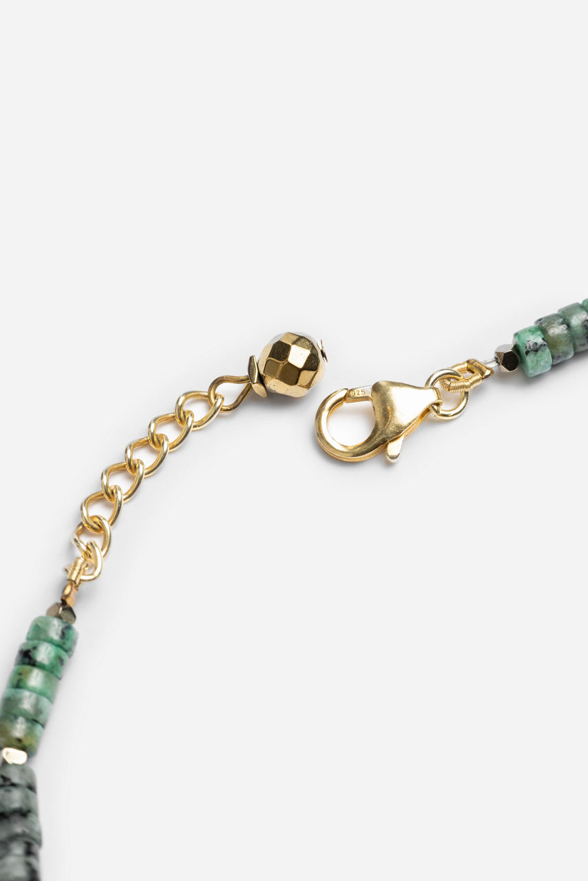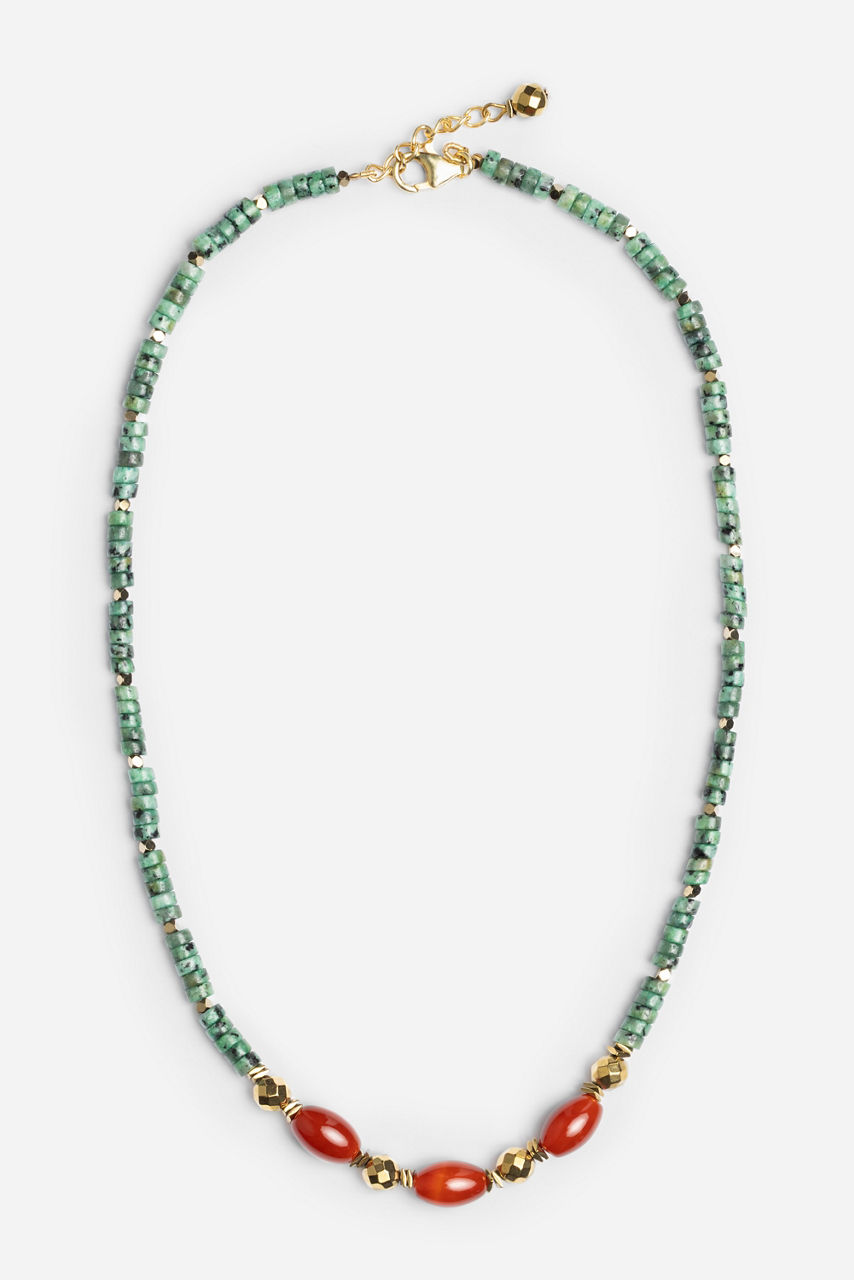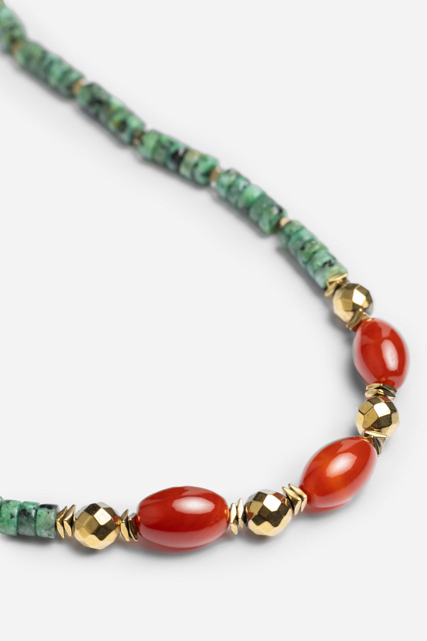 - Materials: Reconstituted turquoise, hematite, carnelian, 24k gold-plated 925 sterling silver clasp
