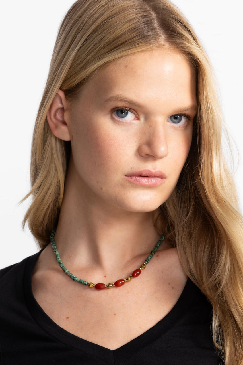 Gold-accented hematite and carnelian beaded necklace, the Away We Go' brings vibrant tones and natural textures together in a standout piece that anchors your entire look. Let it shine with a deep neckline or layer it over a simple knit to elevate everyday outfits.