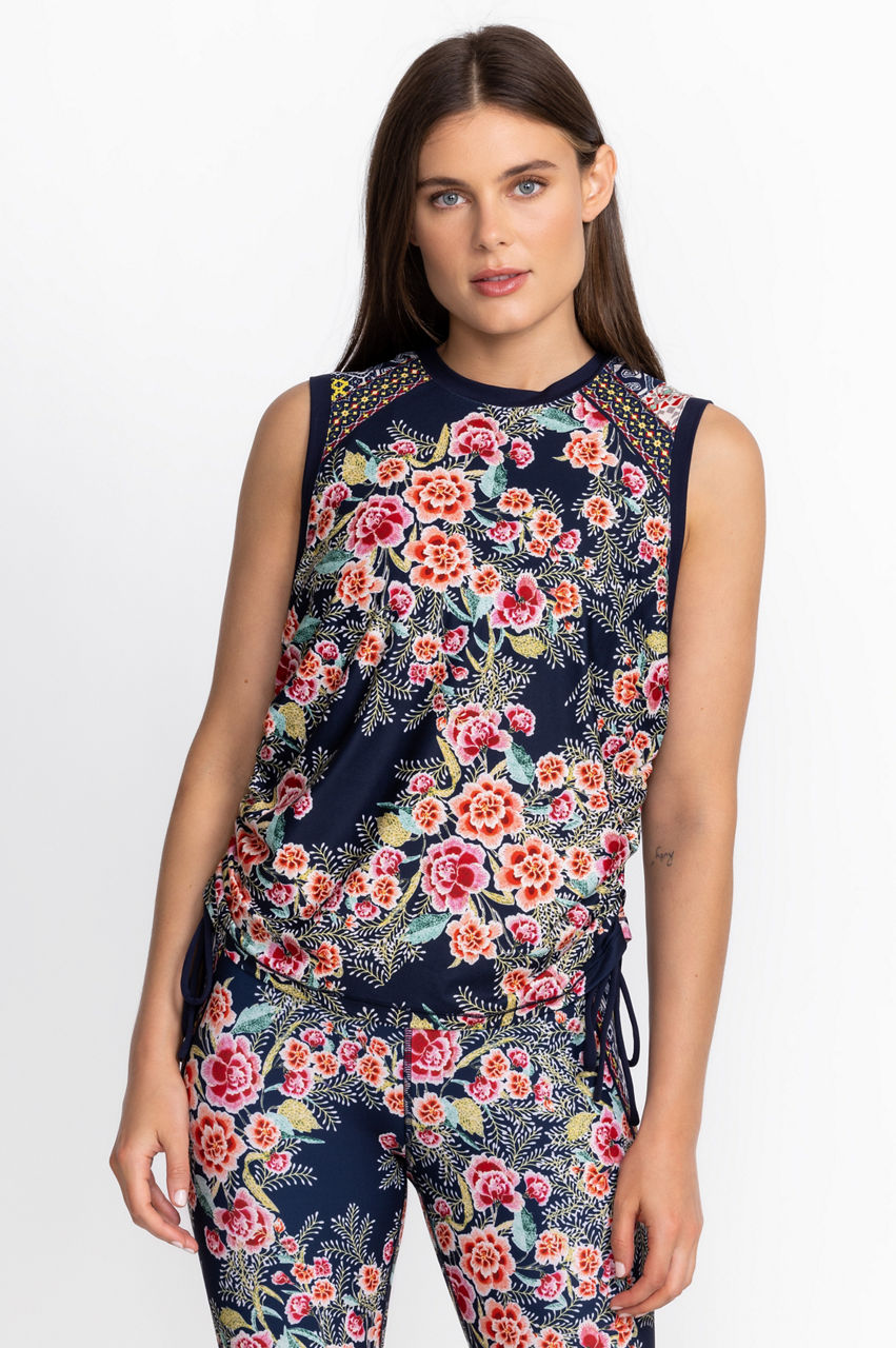 Crafted from a moisture-wicking material with a touch of stretch, the Aztec Flower Ruched Muscle Tank is a symphony of feminine details on a sports-inspired silhouette. This tank features a round neck, fragrant flowers in pink shades, and ruching at the sides with ties for an adjusted fit. Pair this tank with the printed leggings for a matching head-to-toe look.