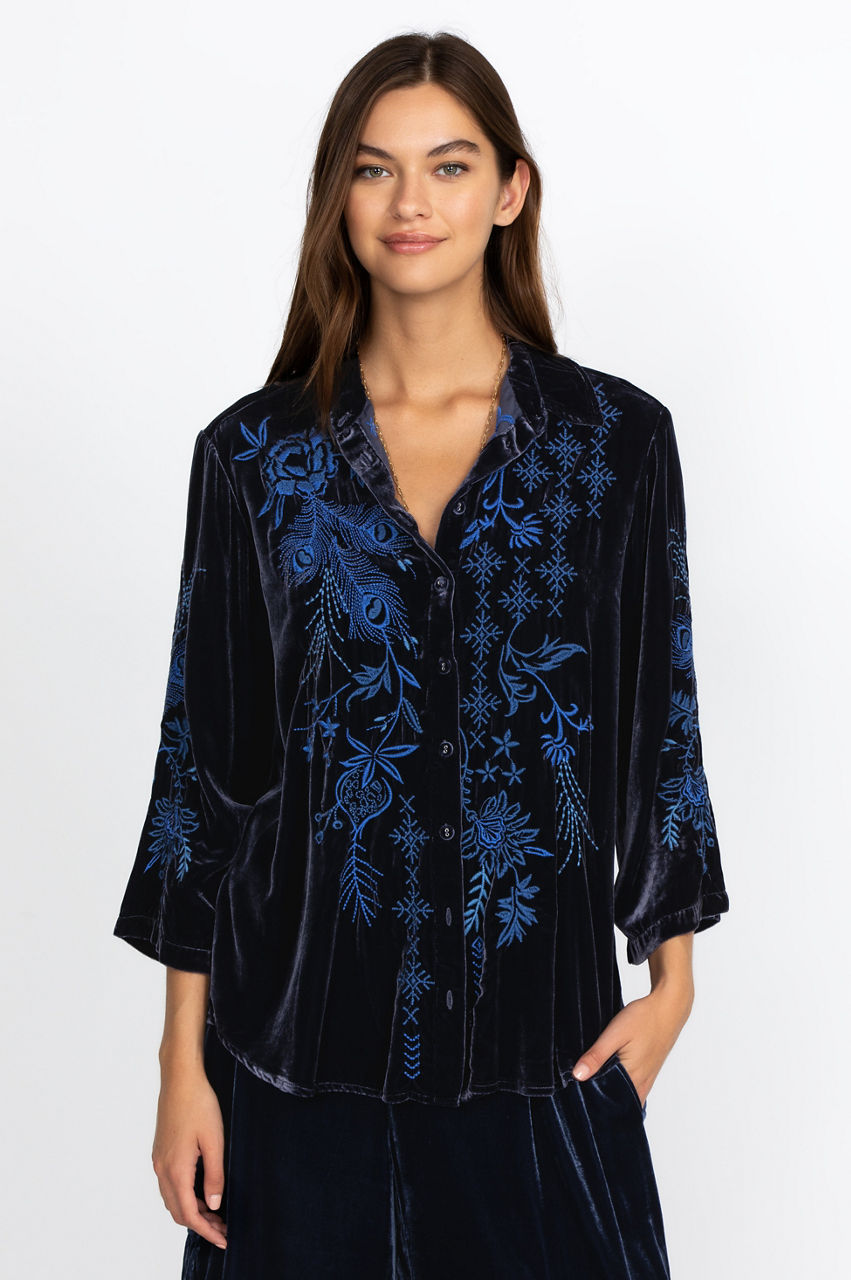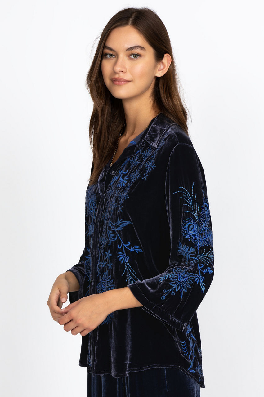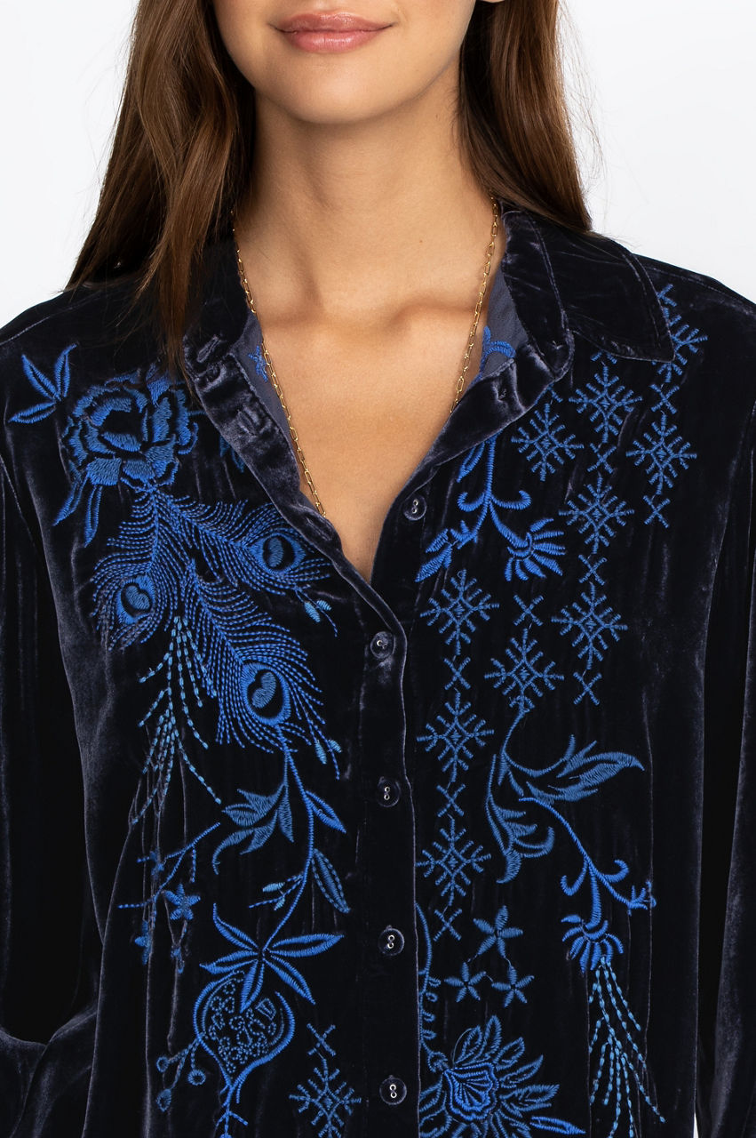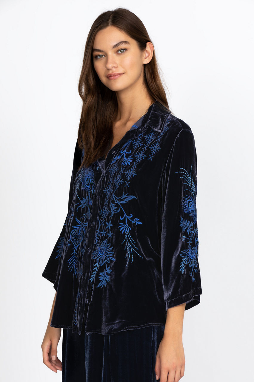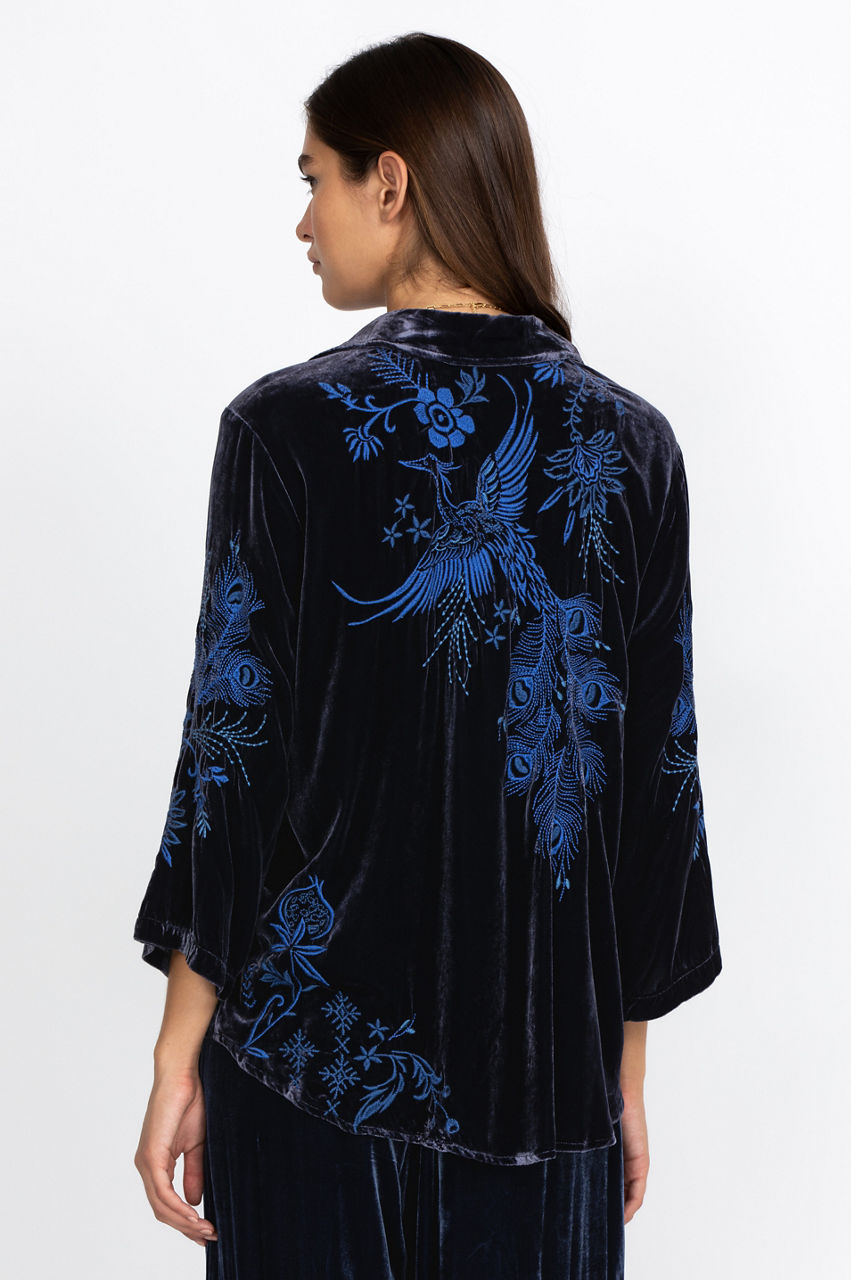 This smooth kimono is a versatile piece that you can wear to lounge at home or dress up for a night out. With its rich hue and elegant embroidery, the Azure Velvet Kimono Sleeve Shirt is an undeniably sophisticated piece. Pair it with soft leggings for a relaxed look, or combine it with slacks for a business casual outfit.
