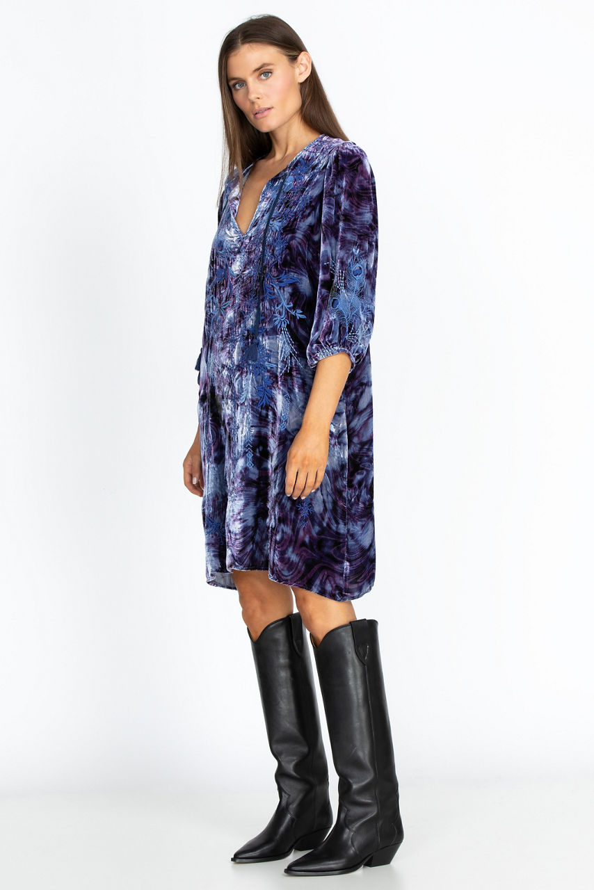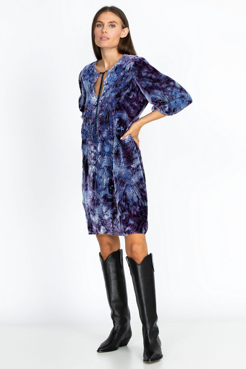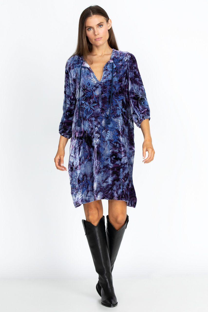 The Azure Velvet Relaxed Dress is a flowy piece that will add movement and originality to your outfits. The print mixes floral and abstract motifs for an artisan-inspired feel, while the embroidery and tassels turn this dress into an exquisitely fashionable piece. Pair it with knee-high boots and a fringed handbag for a boho-chic look.