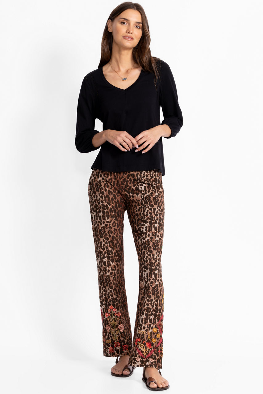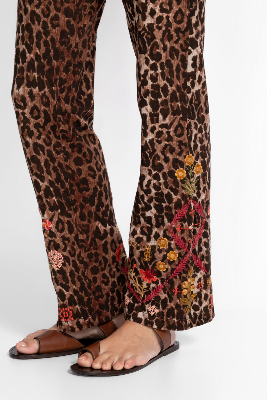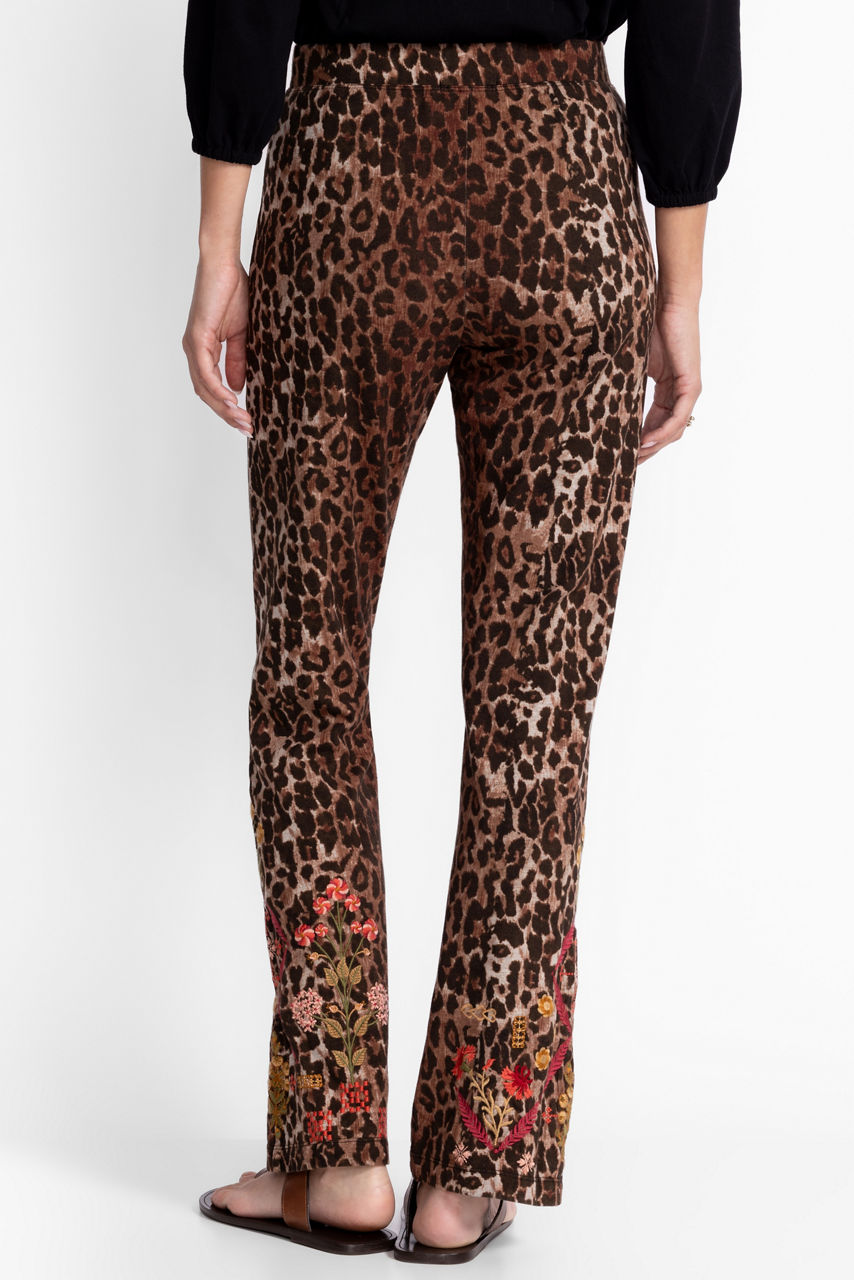 The Baby Boot Leggings are crafted from a breathable cotton blend with a hint of stretch. Featuring an elastic waist and bootcut leg line, these leggings are adorned with a vibrant animal print and are finished with intricate embroidered details. Pair with a black linen button-down and western-style boots for a fun night out with friends.