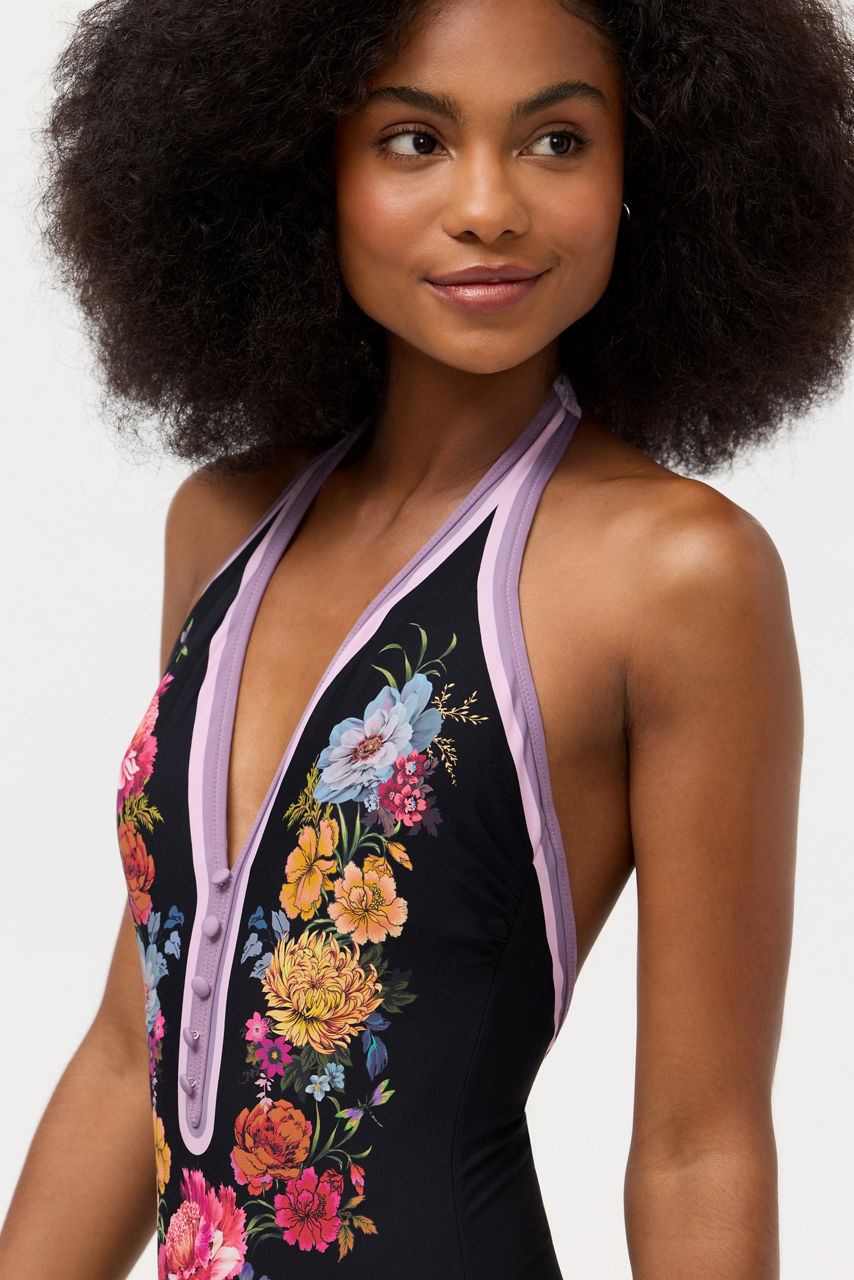 Adorned with vibrant floral patterns against a rich black backdrop, the Baccara Halter One Piece offers a distinctly feminine silhouette. Designed with a halter neckline with contrasting piping that ties at the back of the neck, this stunning suit is cut with a scoop back and faux button front for added detail. Pair with the Baccara Wrap Pants and kitten heels for a resort-inspired look that will easily go from poolside to brunch.