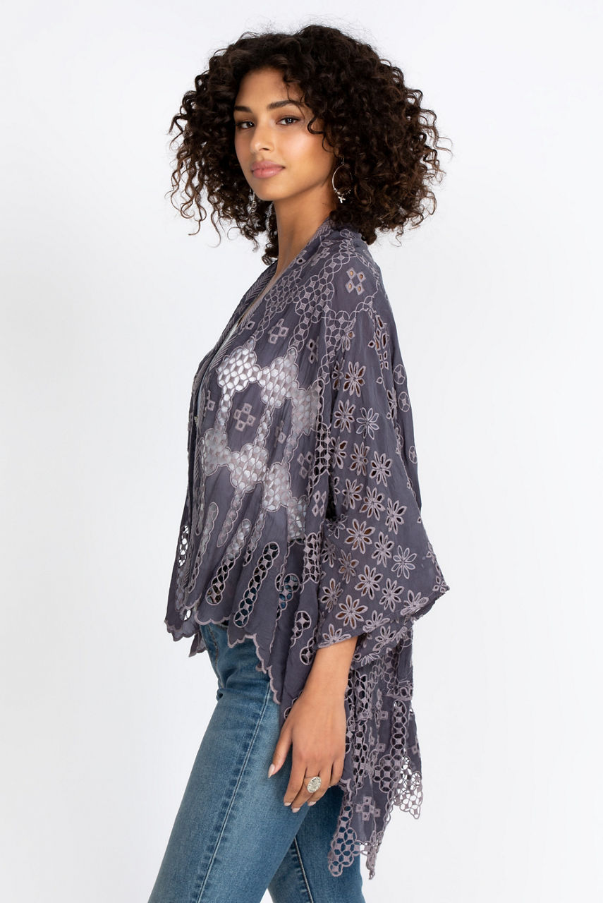 This refined kimono uses geometrical motifs to create a exciting look. The high-low hem and angled sleeves are delightful details that elevate this piece. You can drape this kimono and structure it with a belt for a laidback lounge outfit or use it for layering over a stylish silk top or embroidered blouse for a night out.