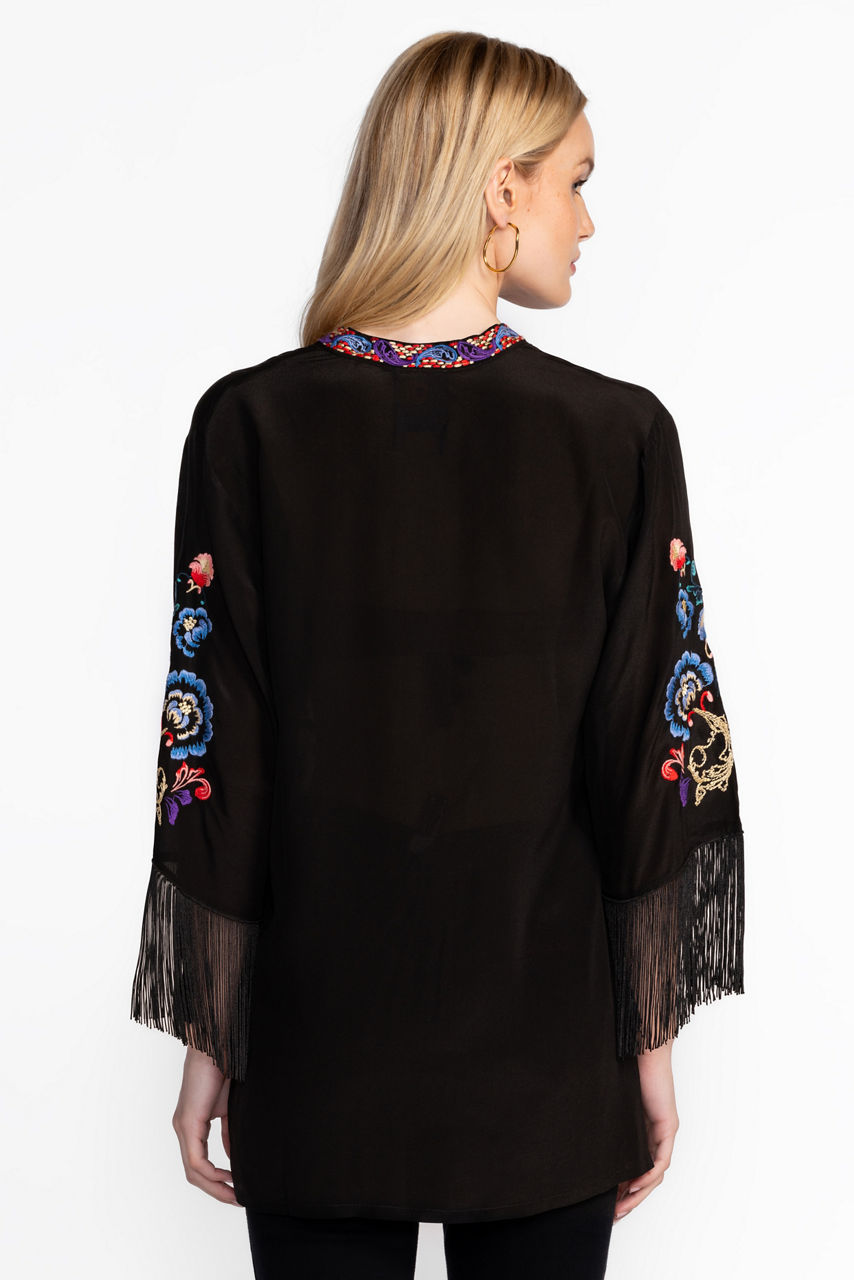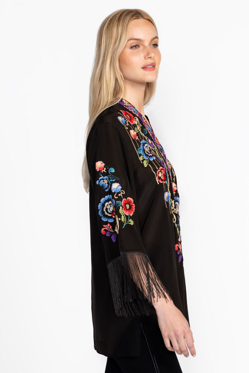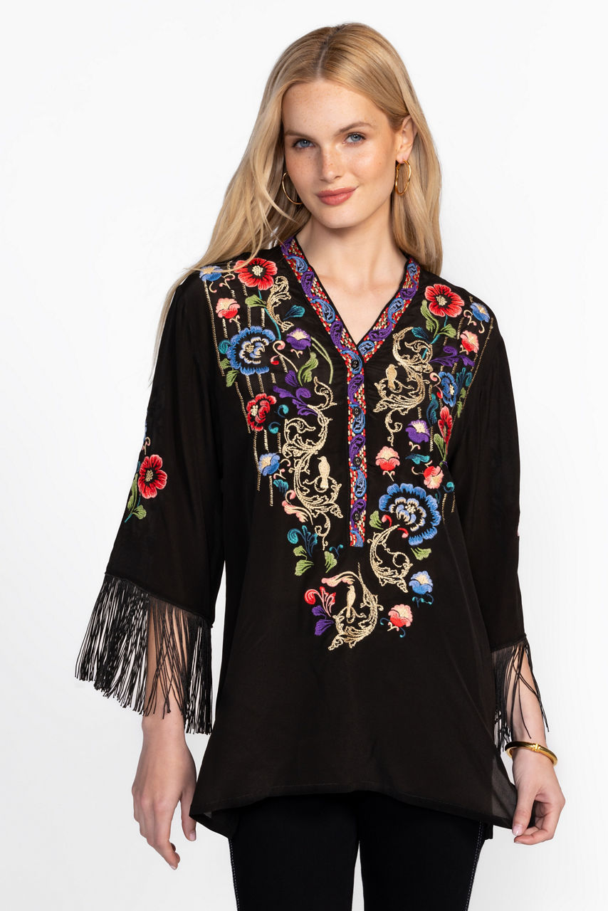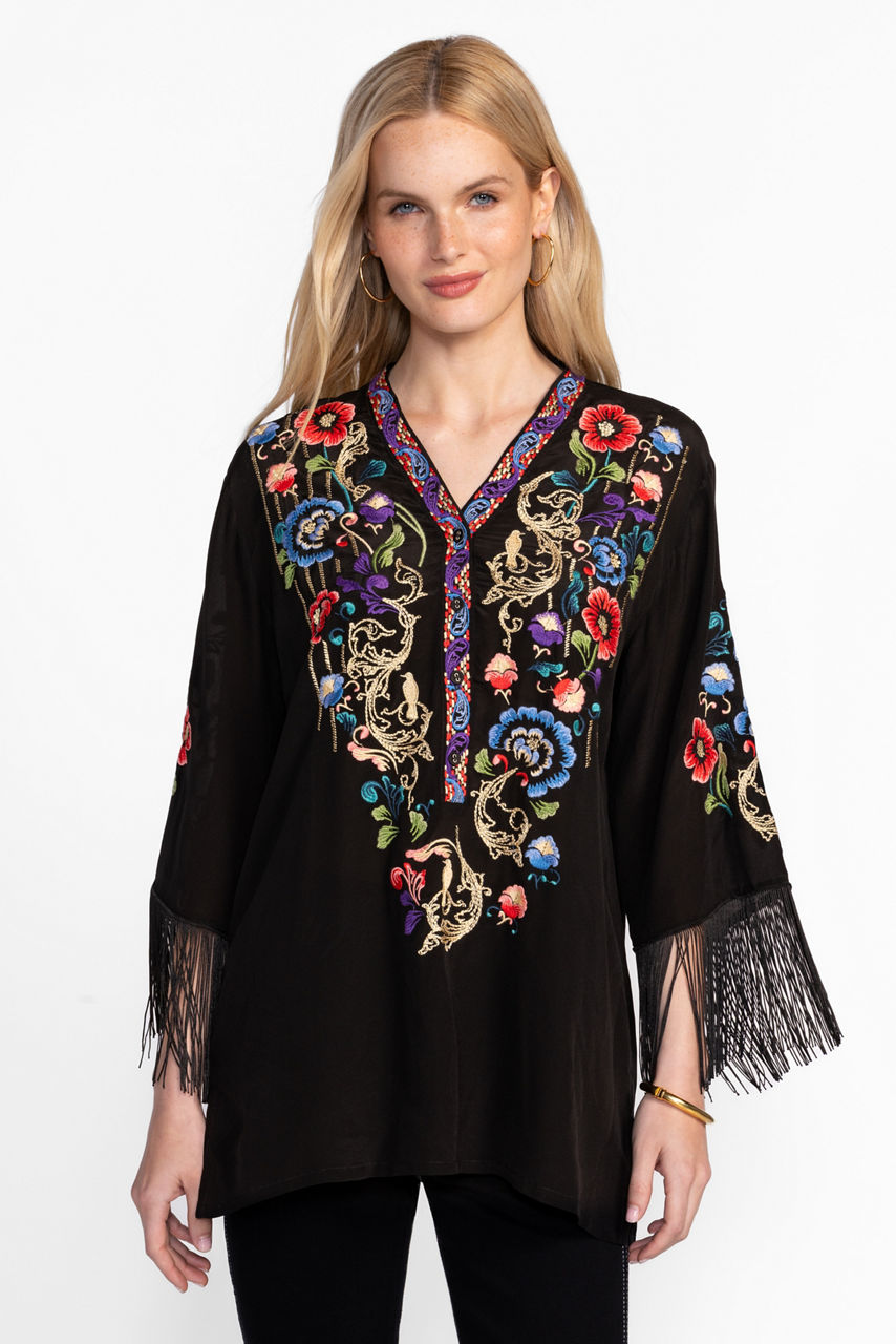 The luxurious Bahia Tunic is crafted from a 100% flowing silk. Featuring a Henley neckline bordered with vibrant floral embroidery for a splash of color, this unique tunic is finished at the sleeves with delicate fringe. Layer over bold wide-leg pants and pair with flats for an eclectic look brimming with style.