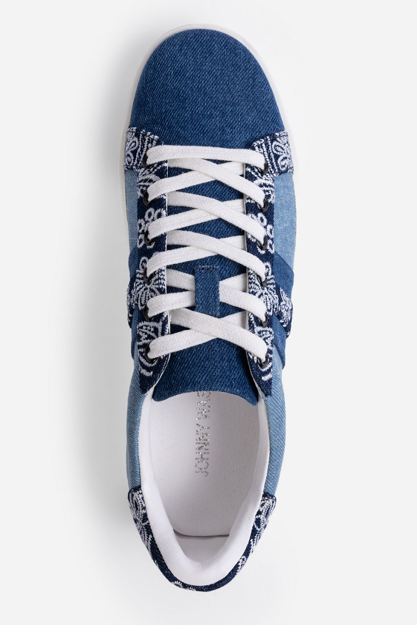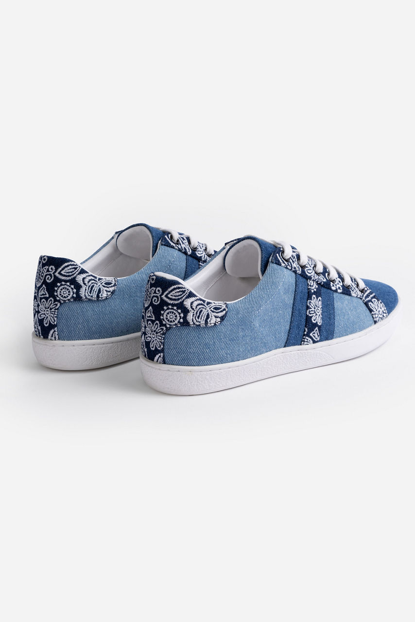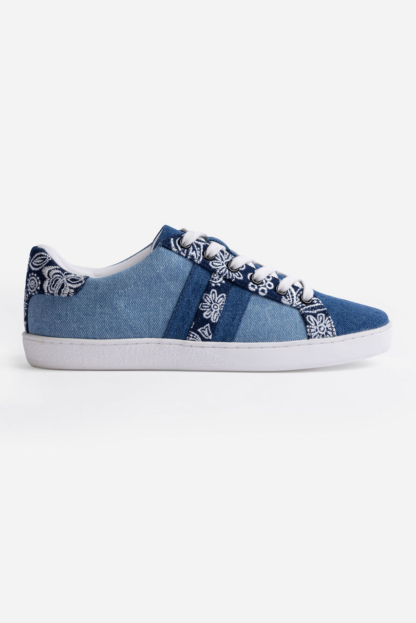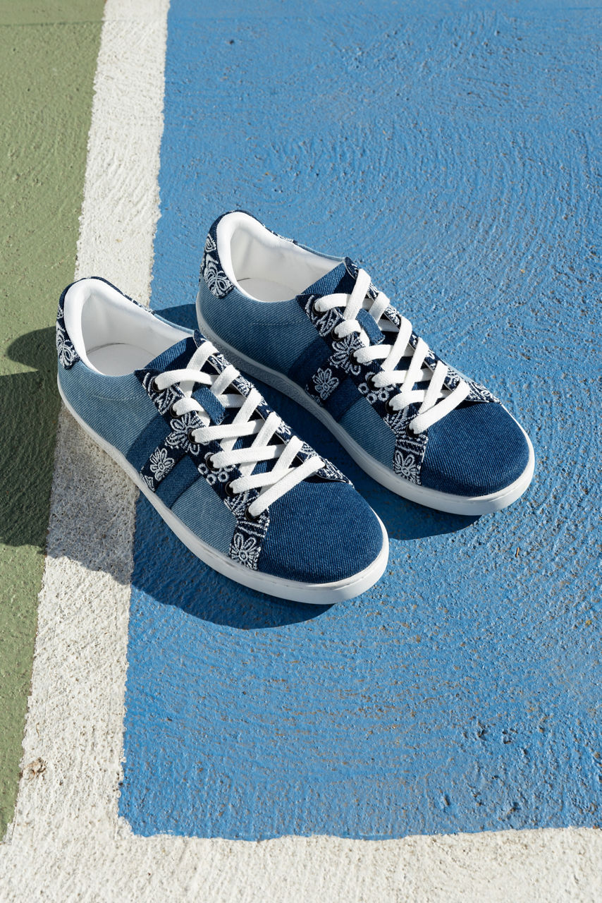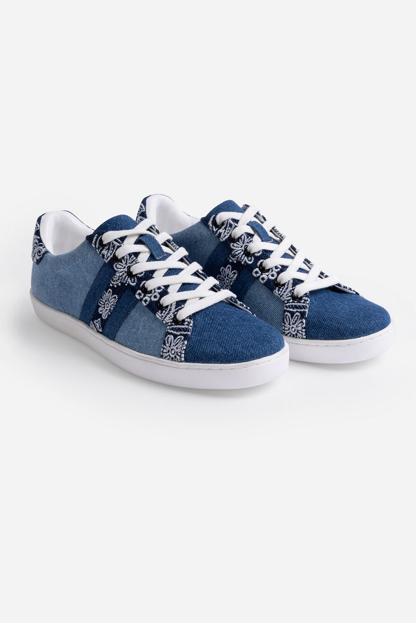 Washed in hues of blue, the Bandana Embroidered Denim Sneakers offer an elevated casual footwear option. Featuring a denim fabric upper embellished with striping fashioned from a classic bandana pattern, these comfy sneakers are finished with white laces and a pristine white outer sole. Pair with white chinos and a button-down for a polished weekend look.
