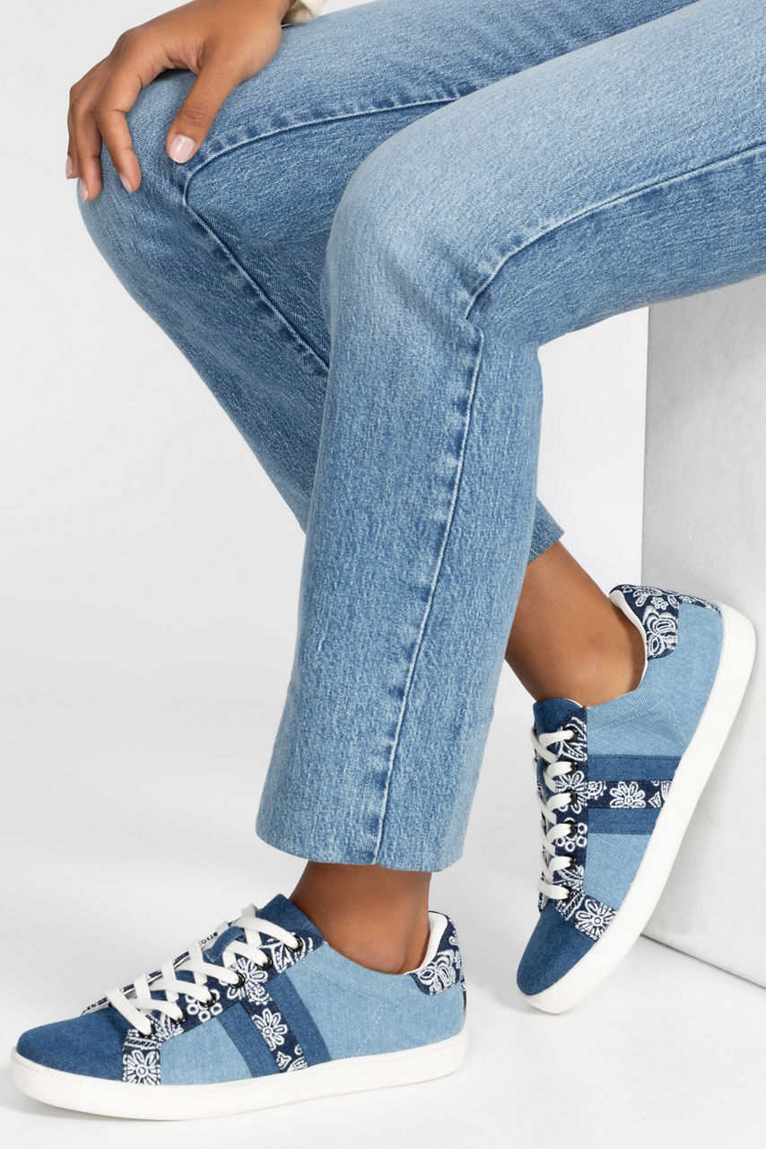 Washed in hues of blue, the Bandana Embroidered Denim Sneakers offer an elevated casual footwear option. Featuring a denim fabric upper embellished with striping fashioned from a classic bandana pattern, these comfy sneakers are finished with white laces and a pristine white outer sole. Pair with white chinos and a button-down for a polished weekend look.