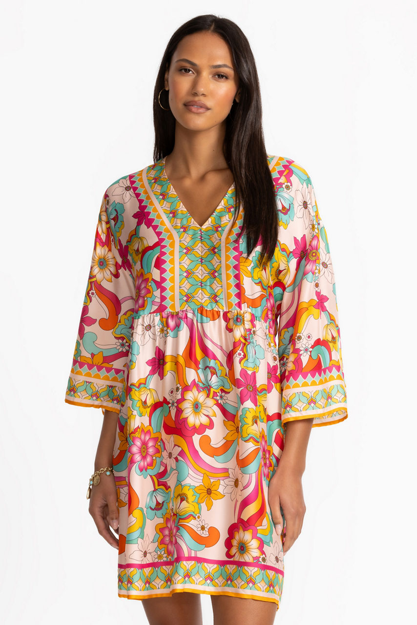 Beautifully crafted from a rich silk blend, the Barbara Mini Dress is washed in bold color and intricate design. Featuring a V-neckline and dropped shoulder, 3/4 sleeves, this vibrant dress is finished with gathers at the skirt for a relaxed fit. Pair with bold jewelry and a coordinating clutch for an elegant daytime event.