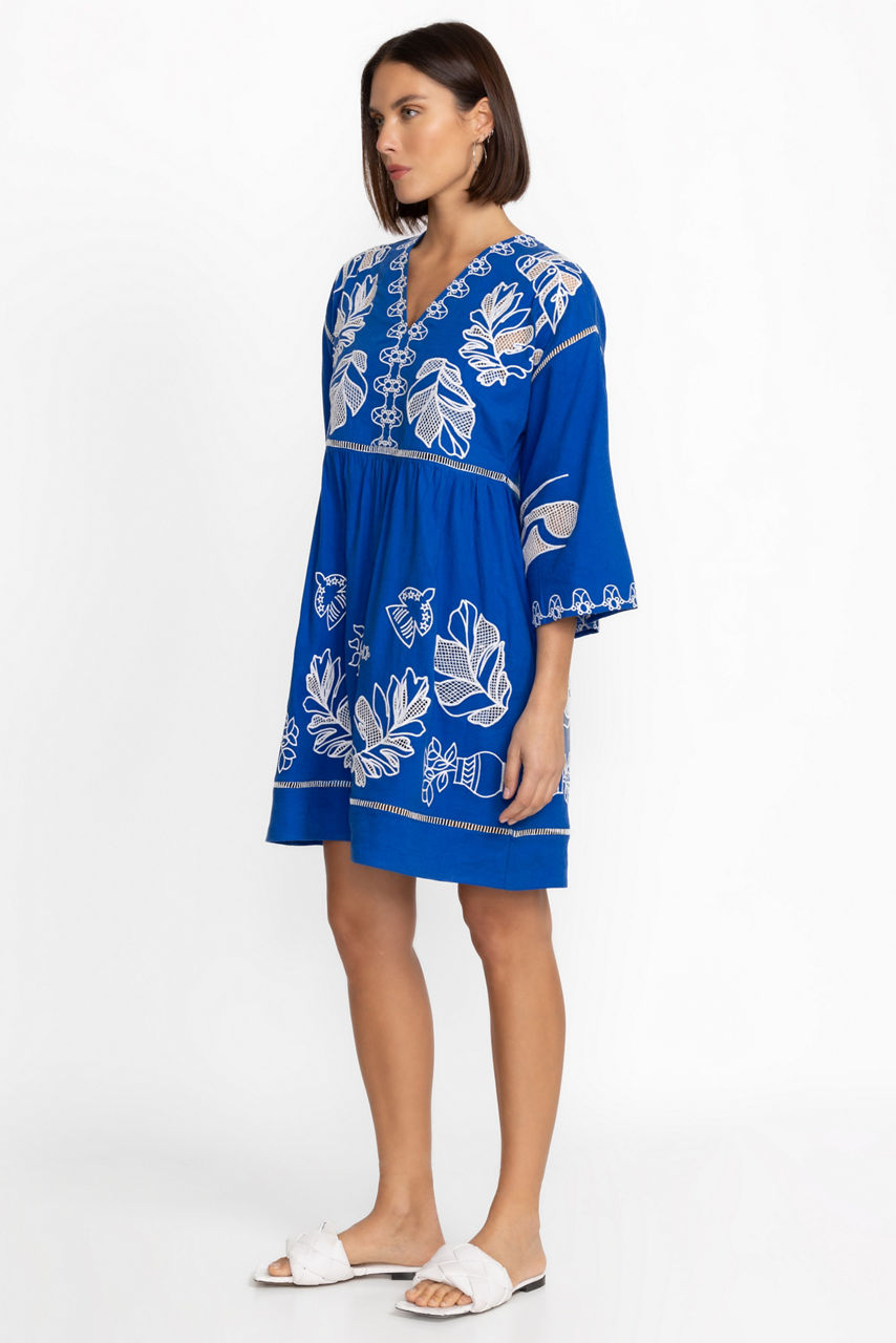Crafted from a breezy cotton and linen blend, the Barbara Mini Dress is resort ready. Featuring a deep V-neckline and a drop-shoulder with relaxed sleeves, this essential mini-dress is ornately detailed with delicate placement embroidery and finished with a gathered skirt. Pair with dramatic sunglasses and a wide-brim hat for lunch beachside.