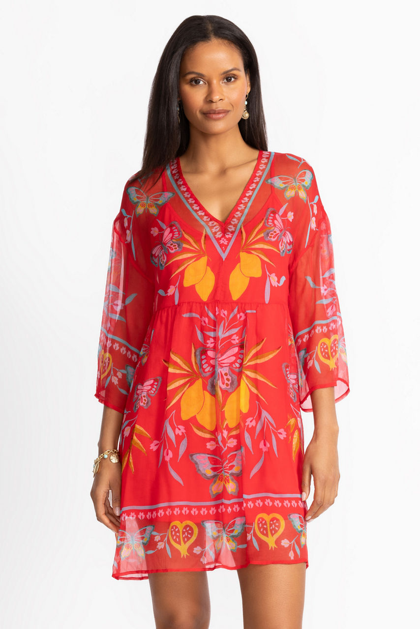 Beautifully crafted in rich 100% silk, the Barbara Mini Dress is washed in bold color and intricate design. Featuring a V-neckline and dropped shoulder 3/4 sleeves, this slip-lined vibrant dress is finished with gathers at the skirt for a relaxed fit. Pair with bold jewelry and a coordinating clutch for an elegant daytime event.