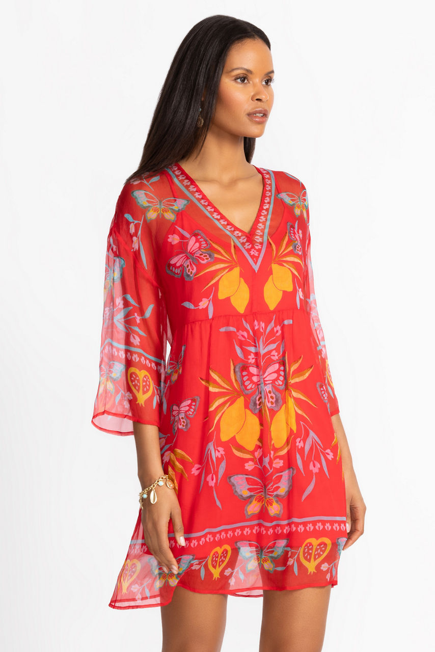 Beautifully crafted in rich 100% silk, the Barbara Mini Dress is washed in bold color and intricate design. Featuring a V-neckline and dropped shoulder 3/4 sleeves, this slip-lined vibrant dress is finished with gathers at the skirt for a relaxed fit. Pair with bold jewelry and a coordinating clutch for an elegant daytime event.