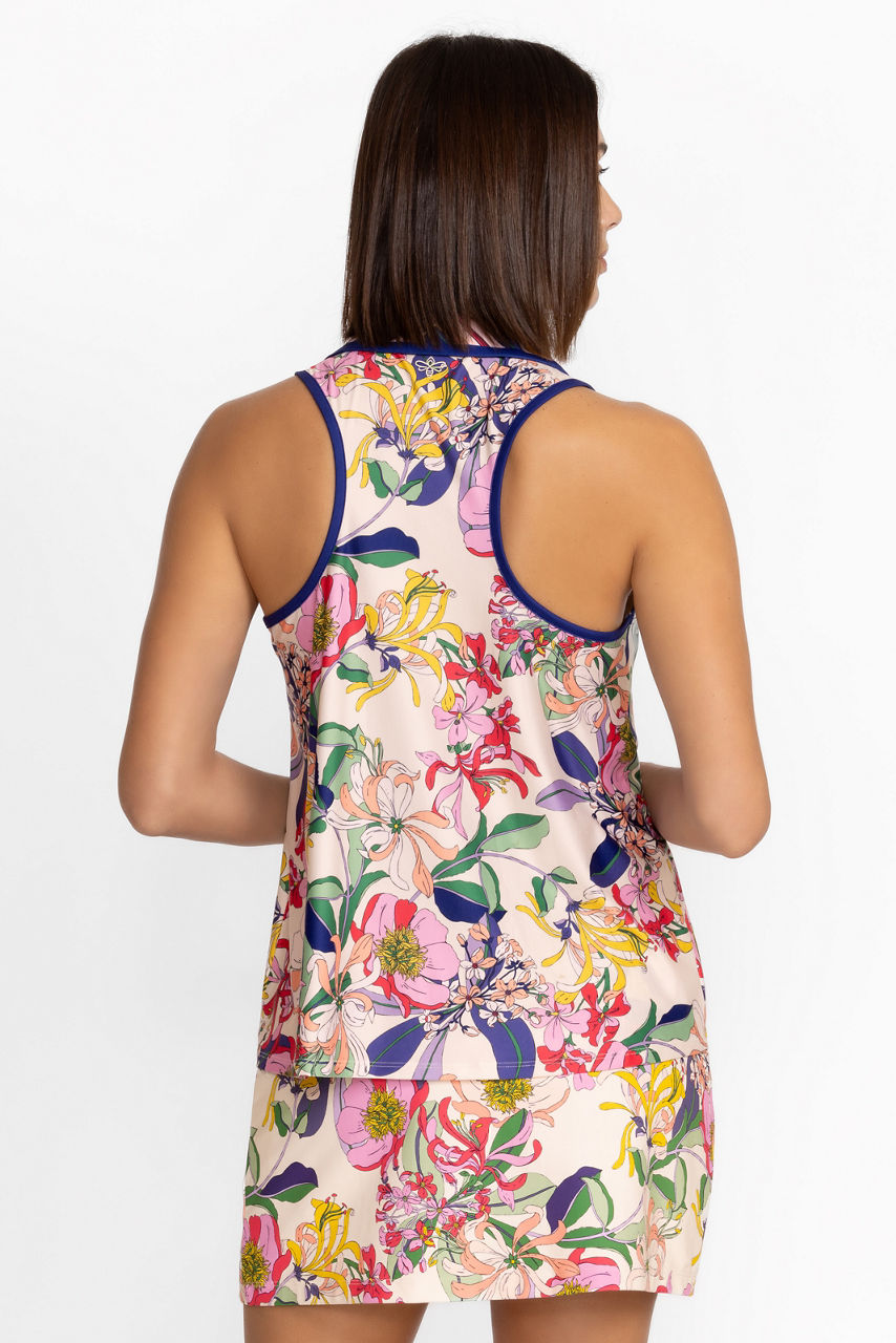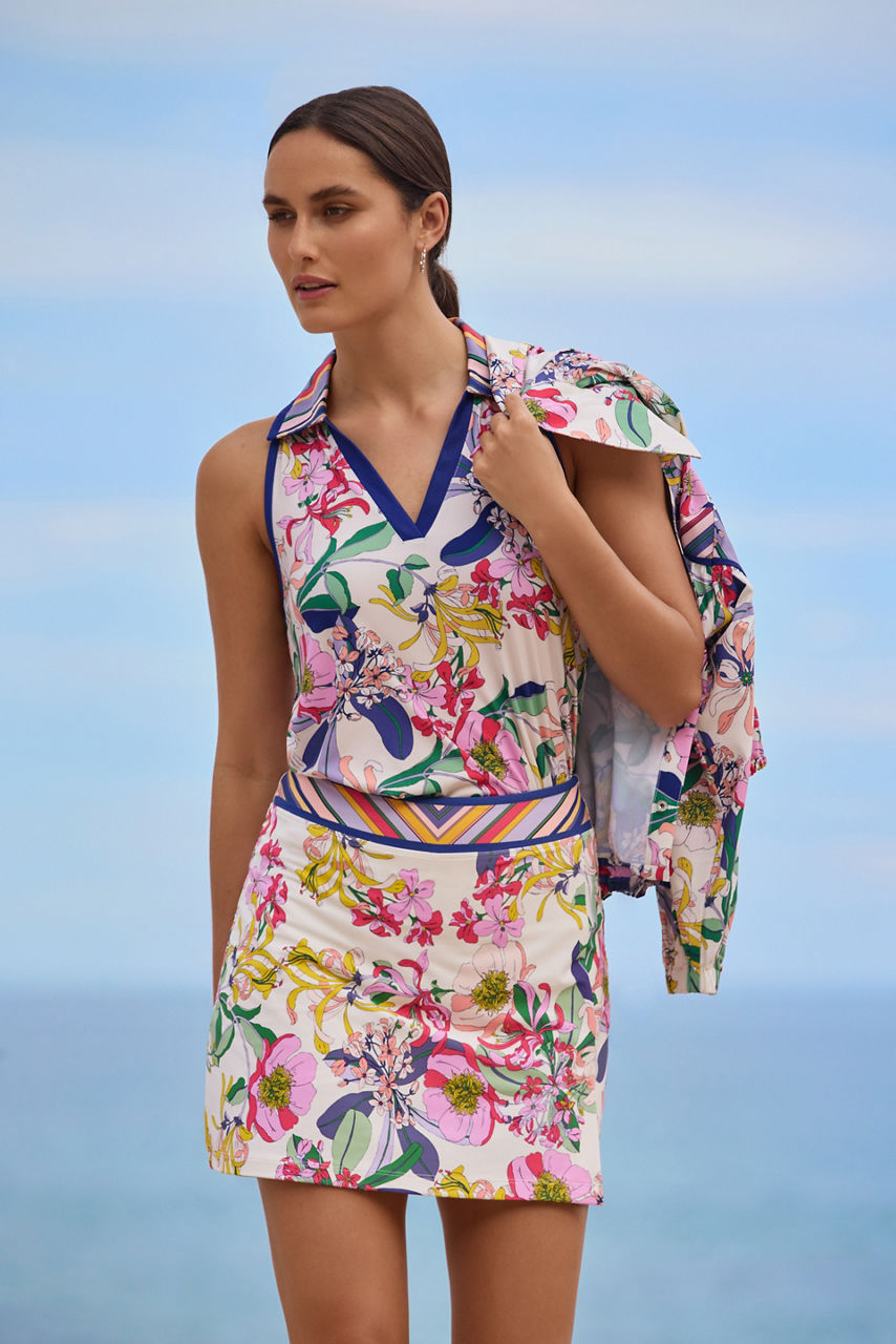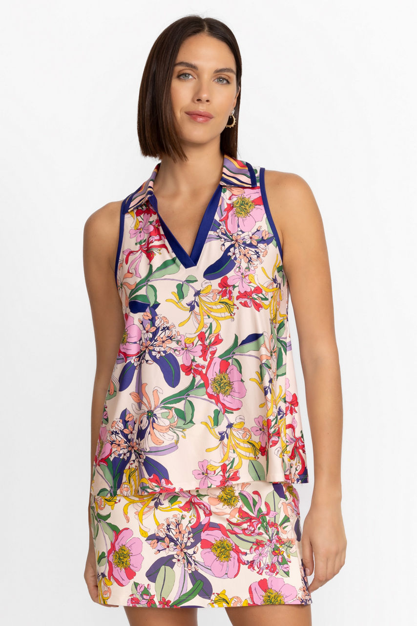 Crafted from lightweight and breathable fabric, the Aldrich Bee Active Polo Swing Tank instantly adds vibrancy to your wardrobe. Offering athletic touches such as a V-neck, racerback, and swing silhouette this top is adorned with a soft, multicolored pattern against a bolder outline. Combine with white shorts or leggings for a breezy summer look.