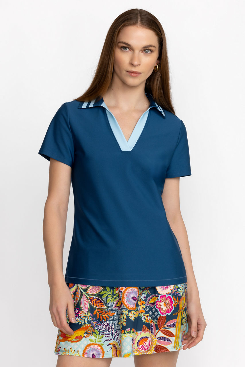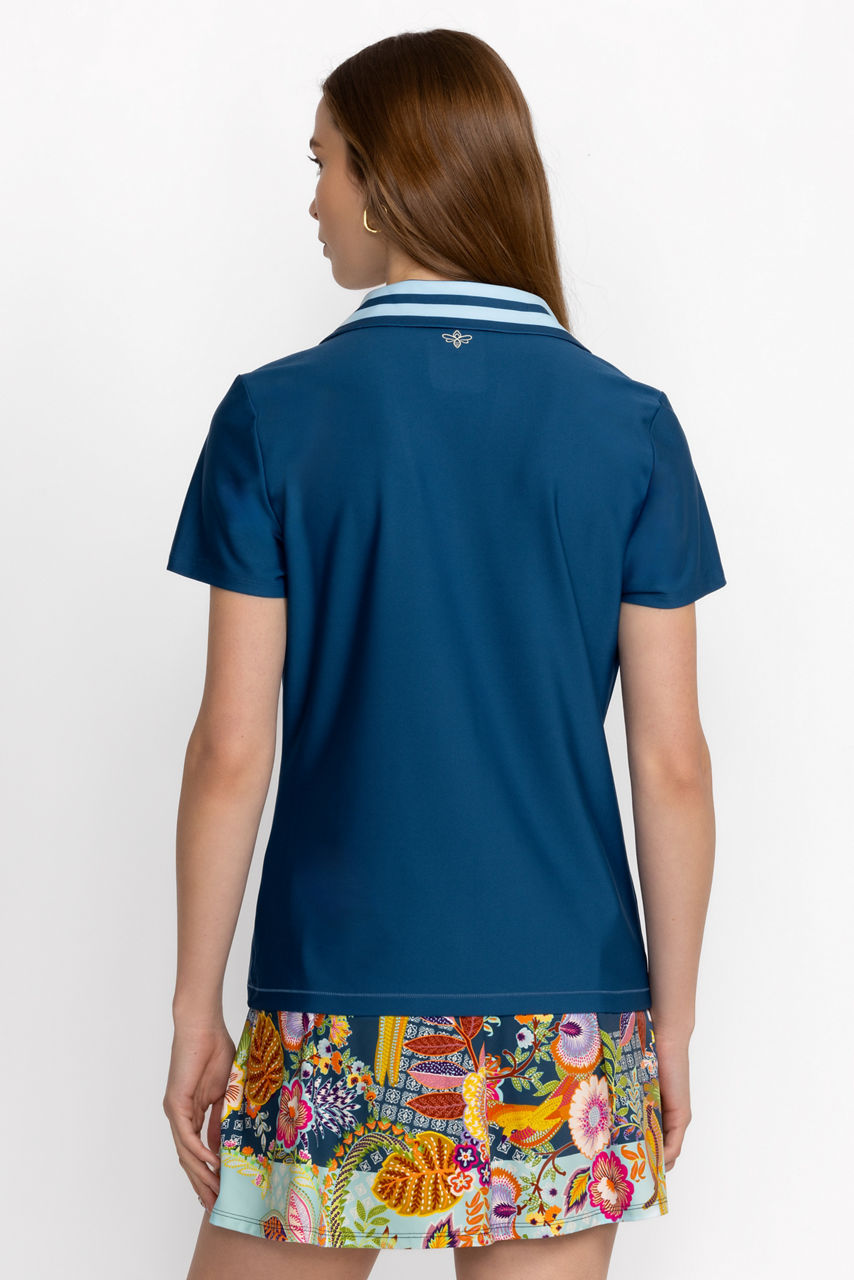 Presenting a perfectly polished activewear top, the Poseidon Basic Polo Tee reimagines a classic silhouette with a splash of color. Consciously crafted from a recycled fabric blend, this fitted top features a V-neckline and traditional polo collar. Pair with the Wild Bird Tennis Skirt to complete the look.