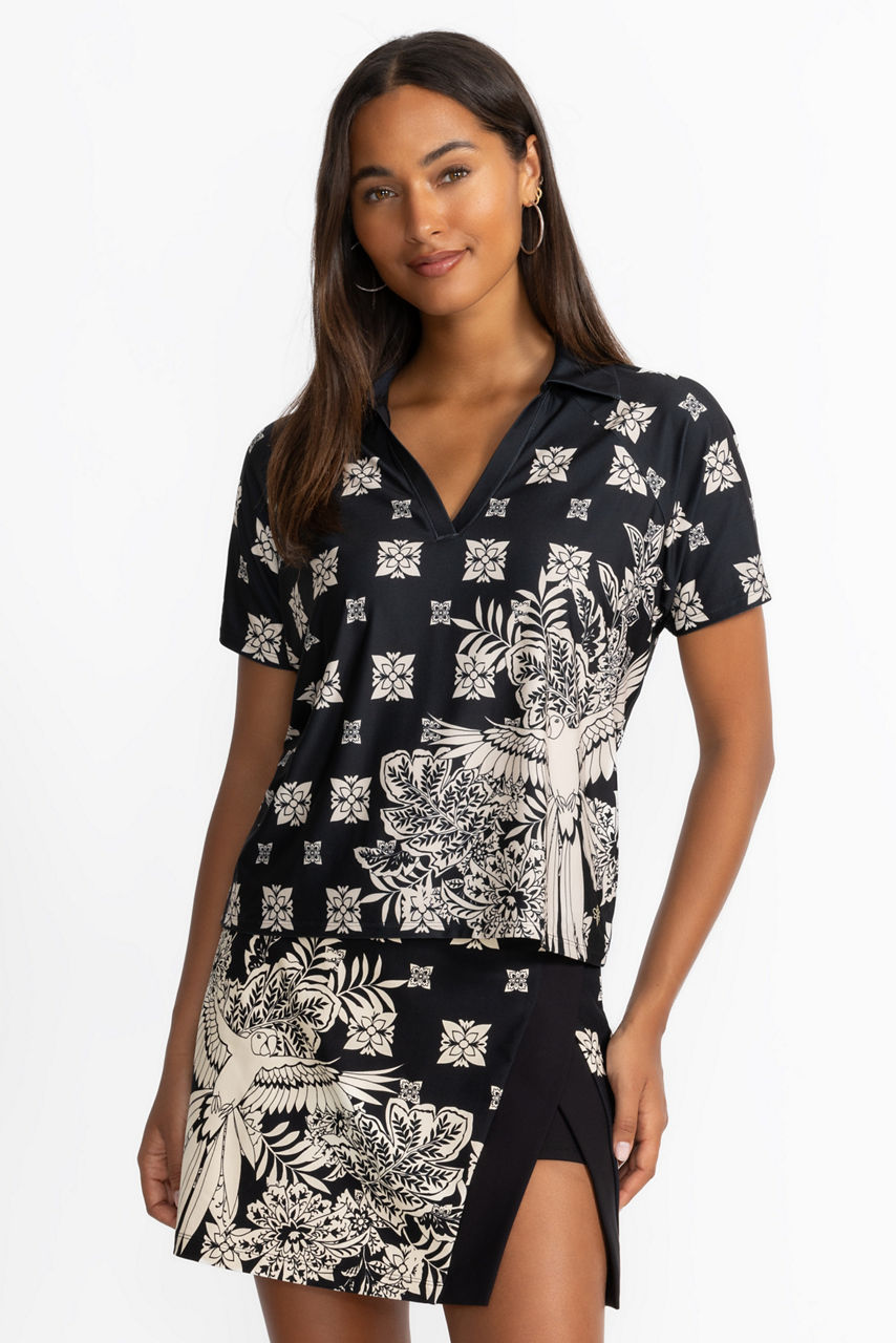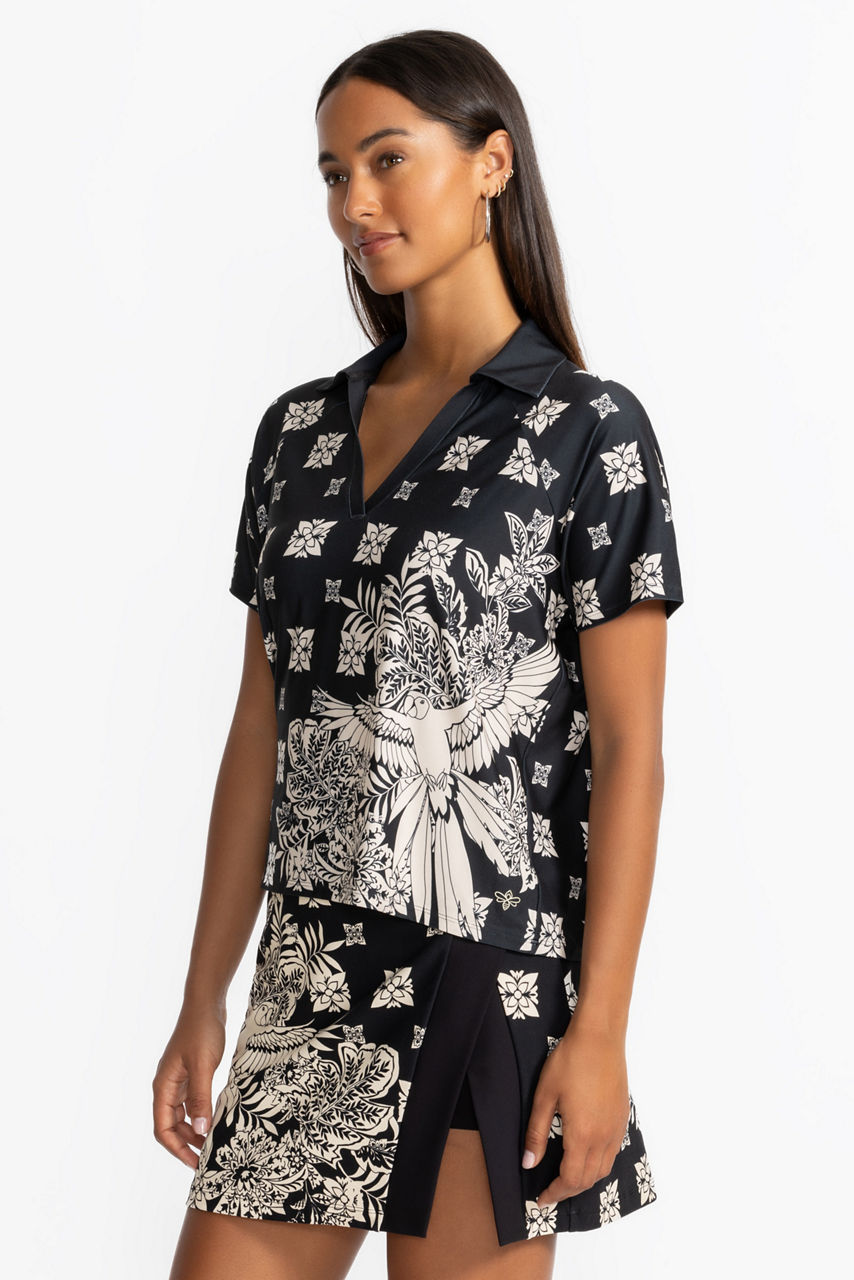 Designed in a stunning black and white motif, the Bee Active Boxy Polo Tee features a bold graphic depiction of a majestic bird in flight. Crafted from a lightweight fabric with a hint of stretch, this casual top offers a split front V-neck with a polo collar and is finished with a distinctive curved hemline. Pair with a white tennis skirt and athletic sneakers for a day on the tennis courts.