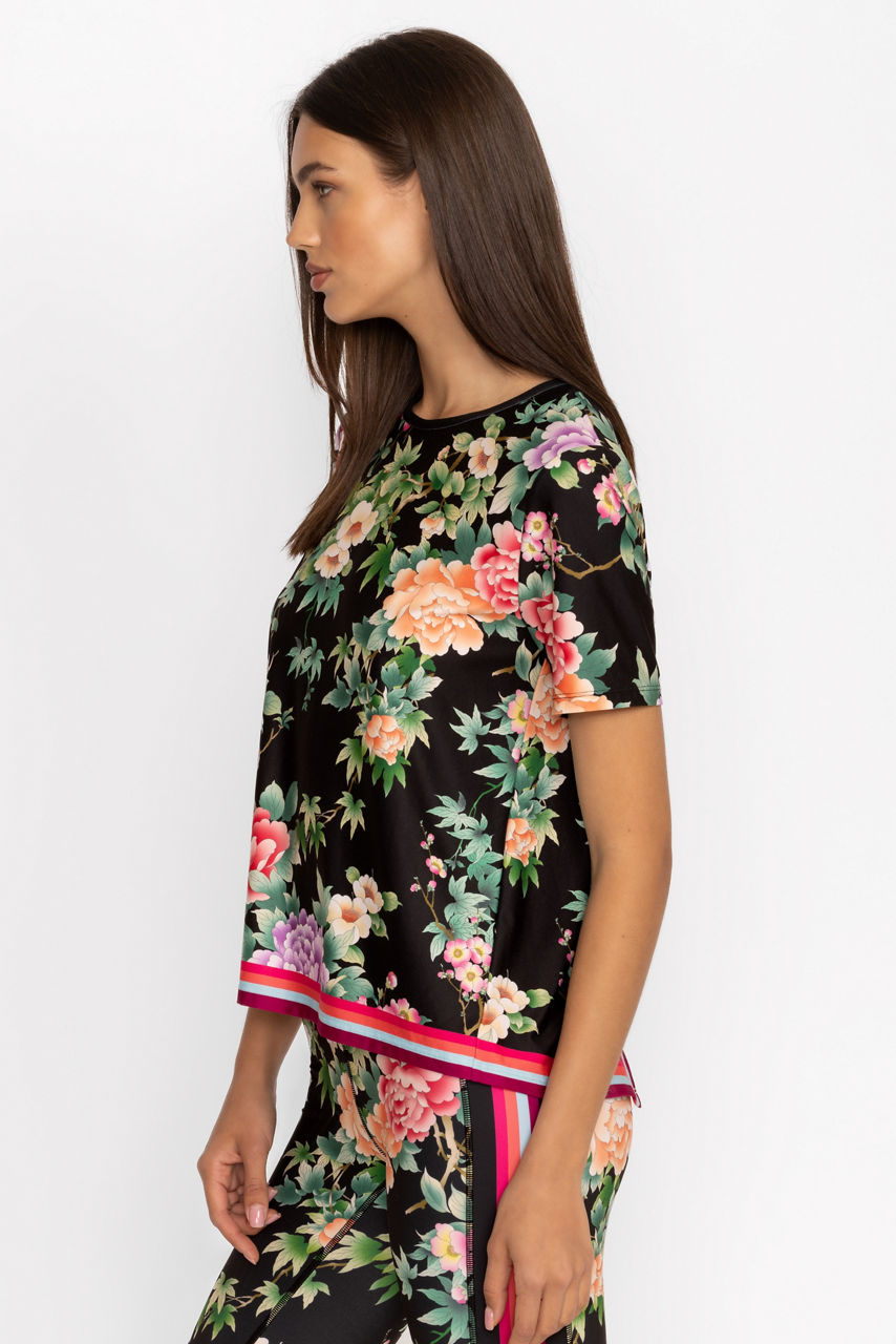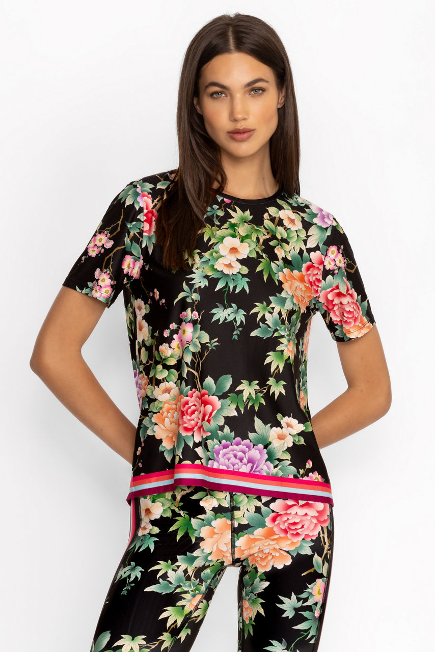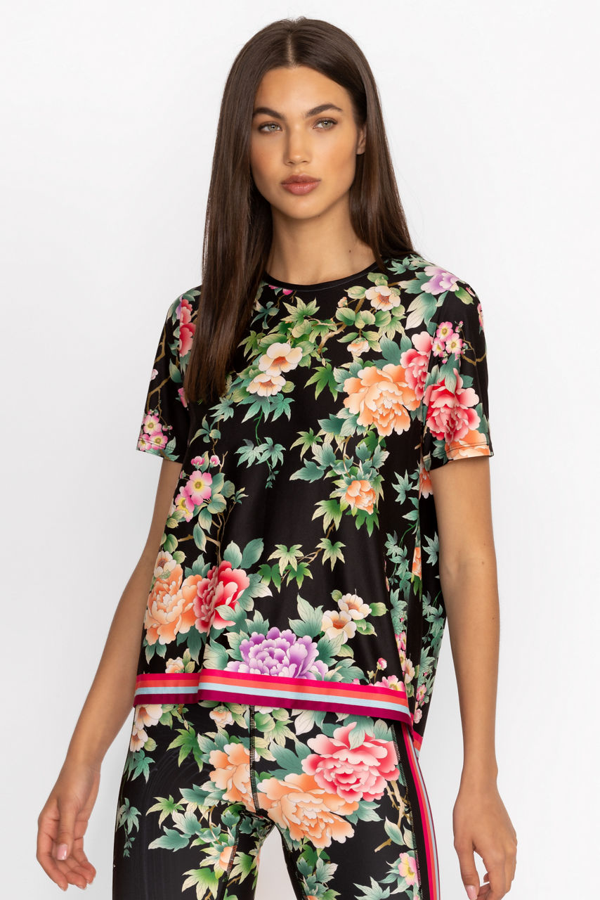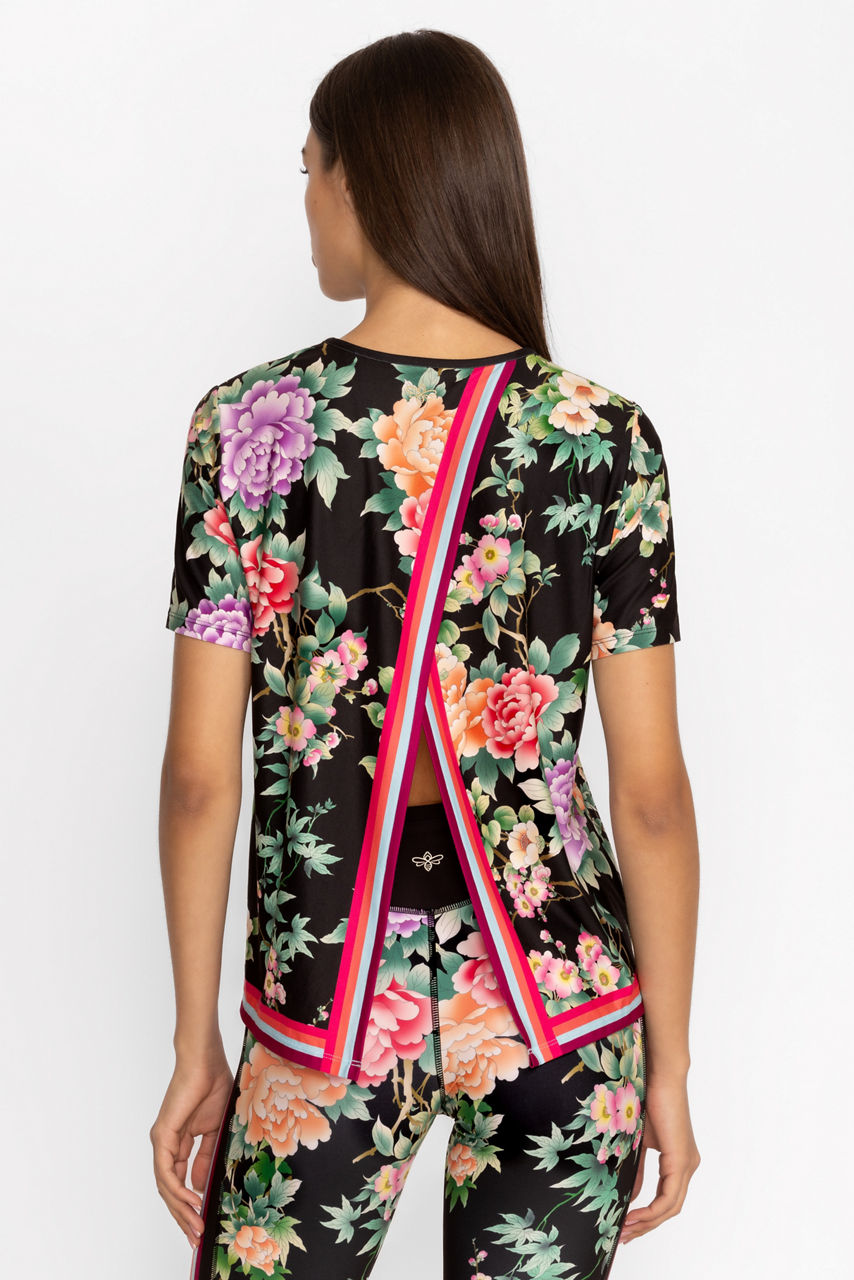 Beautifully adorned with bold floral bouquets, the Le Jardin Bee Active Cross Back Tee is a fresh take on a classic activewear staple. Featuring a crew neckline and short sleeves, this easy-care tee is finished with an overlapping split back trimmed with colorful athletic striping at the hem. Pair with bold leggings and your favorite trainers for an eye-catching workout look.