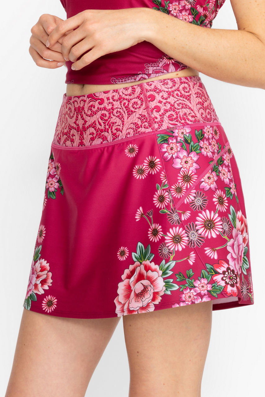 Boldly feminine, the Pink Lace Bee Active Dolphin Hem Skirt is crafted from a lightweight, easy-care fabric. Featuring a contrasting waistband and ornate floral patterns, this skirt offers attached shorts and an interior pocket and is finished with a gently curved dolphin hemline. Pair with the Pink Lace Mesh High Low Top for a perfectly coordinated active look.