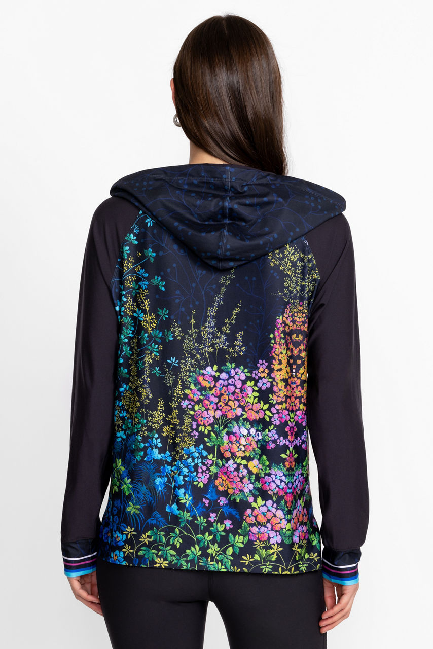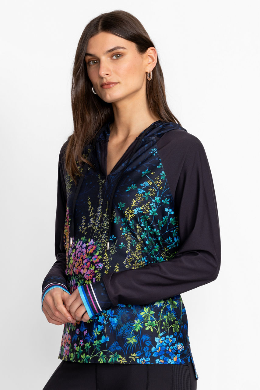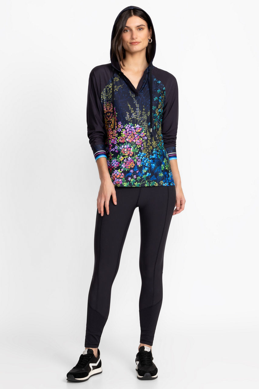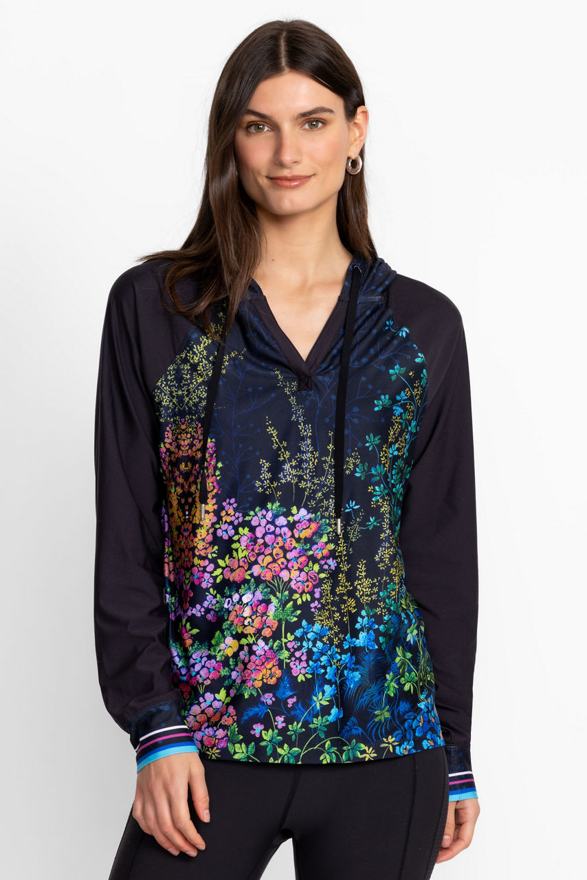 Intricately embellished with a vibrant garden scene rich in color, the Bee Active Featherweight Pullover Hoodie is an activewear essential. Featuring a split V-neckline with an attached hood, this pullover is crafted from a lightweight, breathable fabric. Pair with a bold tee and coordinating leggings for a modern active look.