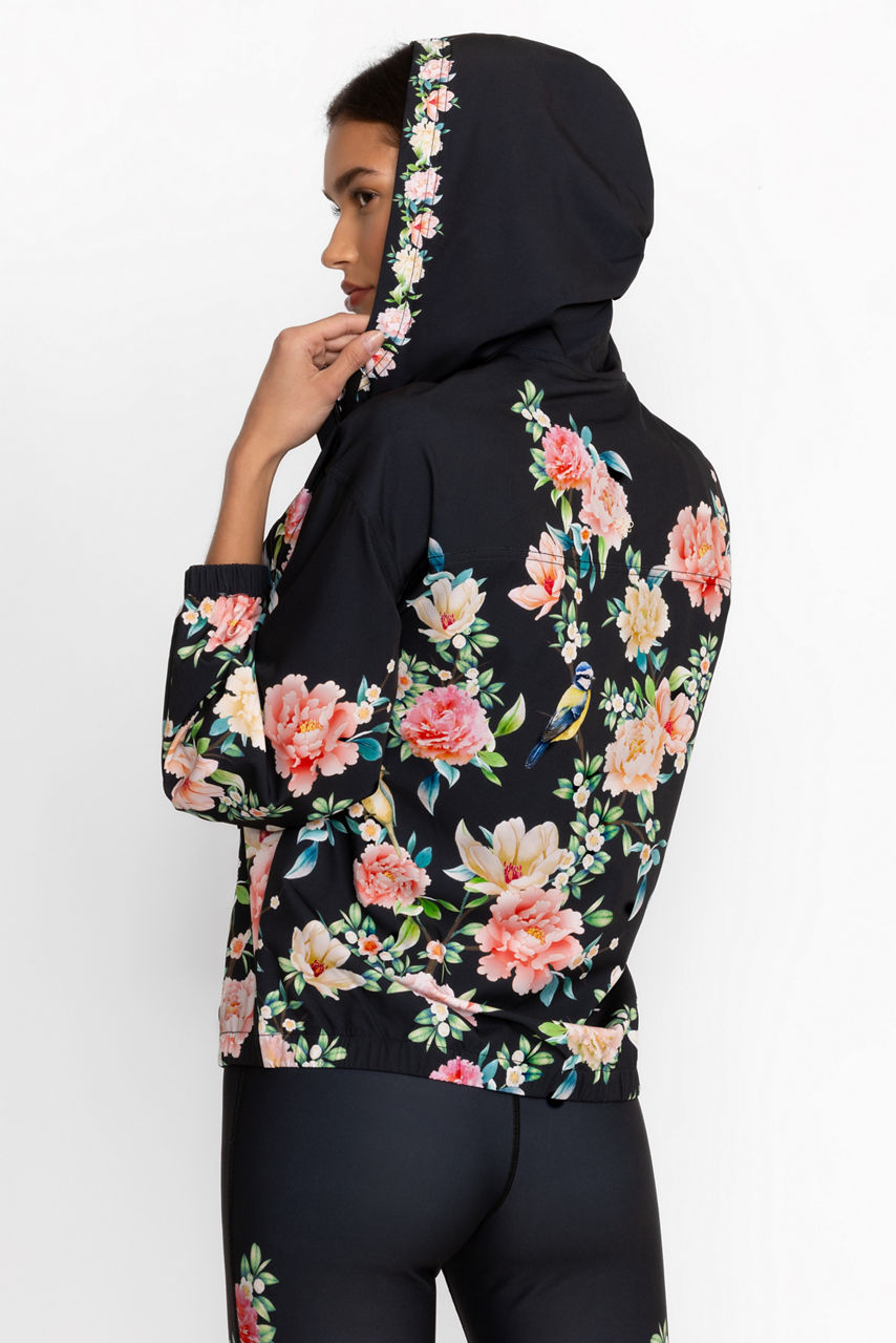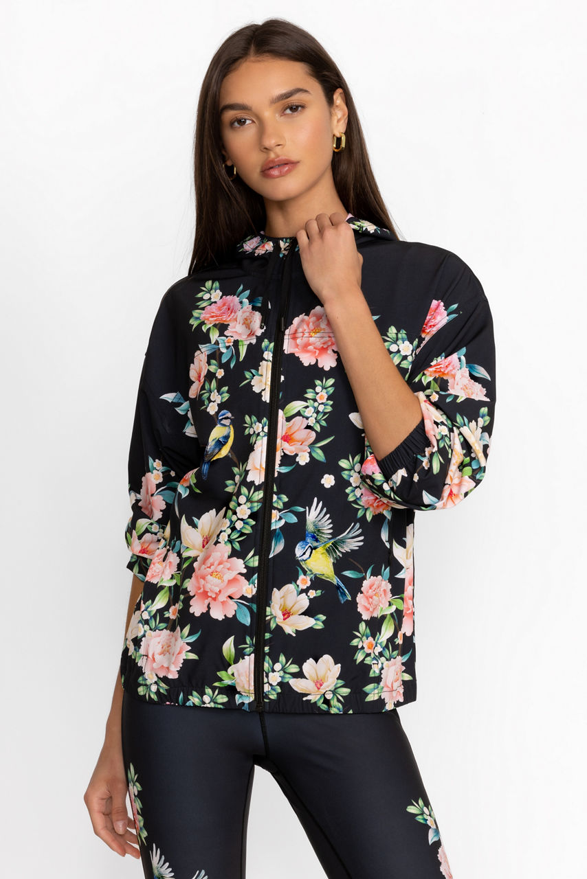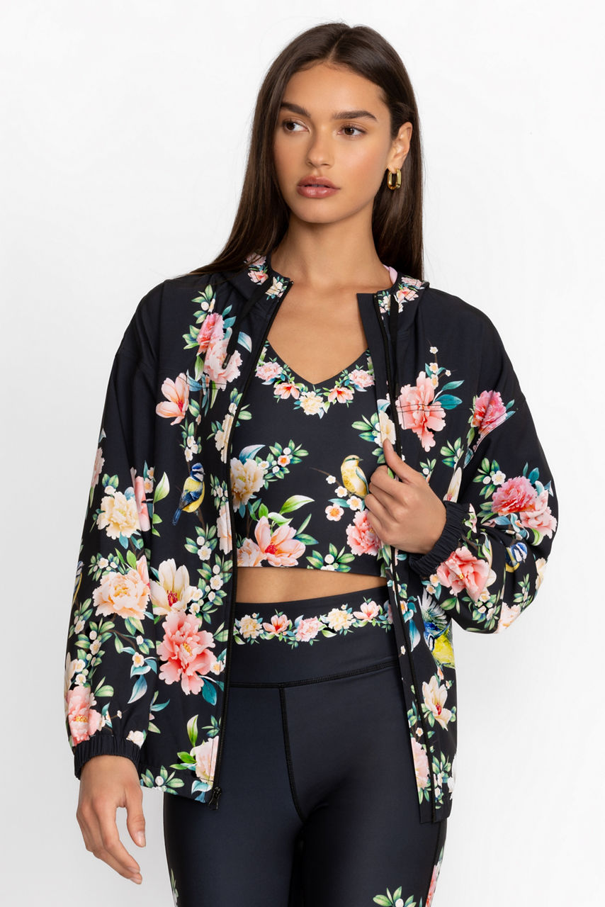 Crafted from a recycled stretch fabric, the Bee Active Full-Zip Jacket offers a fresh take on modern athletic wear. Featuring an easy zip front and cozy hood with drawcord, this lightweight jacket is adorned with beautiful eye-catching blooms for a splash of color. Pair with the Bee Active Side Snap Baby Bell Pants and classic white sneakers to complete the look.