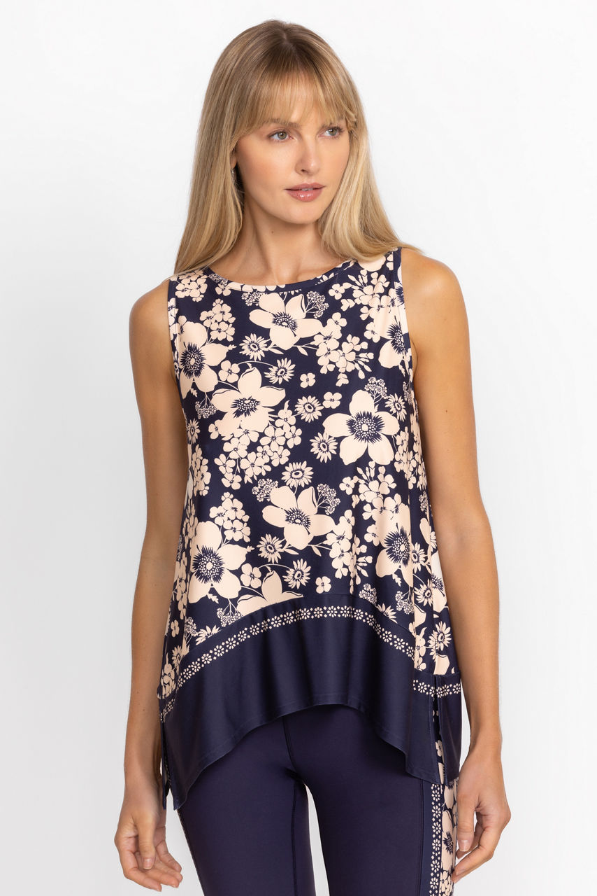 Crafted from a lightweight active fabric with a hint of stretch, the Bee Active Handkerchief Hem Tank is adorned with a fresh floral pattern. Featuring a high rounded neckline and relaxed-fit bodice, this top is finished with side slits and a handkerchief hem accented with a contrasting border. Pair with the Bee Active High Waist Sculpting Leggings and athletic sneakers for a perfectly coordinated look.