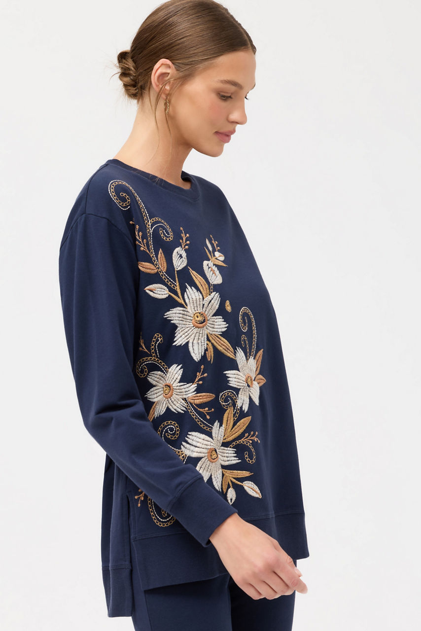 The Bee Active High Low Crew Neck Sweatshirt is crafted from a unique cotton blend with a hint of stretch. Designed with a classic crew neckline and side slits for a relaxed fit, this sweatshirt is embellished with bold floral blooms and scrolling vines. Pair with the Bee Active High Waist Flare Leggings for a perfectly coordinated casual ensemble.