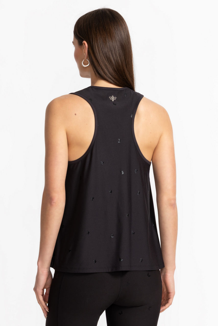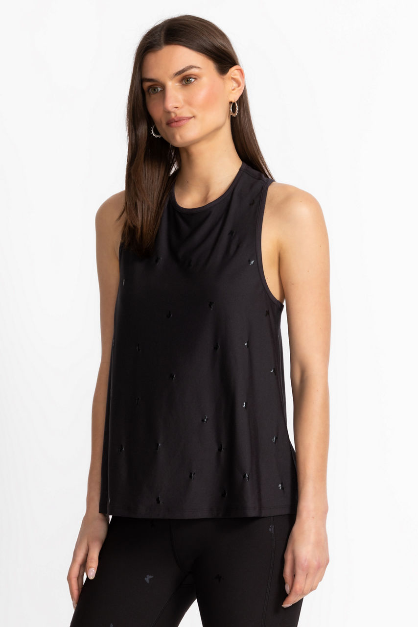 Crafted from a lightweight fabric with a hint of stretch, the Bee Active High Neck Swing Tank is embellished with tiny butterflies in flight. Designed with a high rounded neckline and racerback, this athletic tank is finished with a relaxed swing silhouette for a comfortable casual look. Pair with a coordinating tennis skirt and fashion sneakers for a casual day at the club.