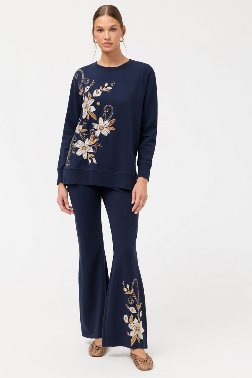 Crafted from a rich cotton blend with a hint of stretch, the Bee Active High Waist Flare Leggings combine comfort and elevated casual style. Designed with an elastic waist and a flared leg, these unique leggings are finished with intricate floral embroidered details along the leg. Pair with the Bee Active high Low Crew Neck Sweatshirt for a relaxed weekend ensemble.