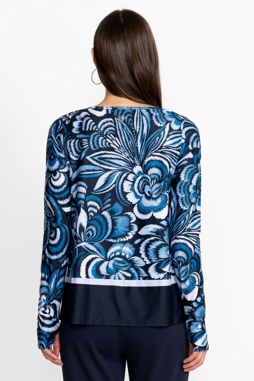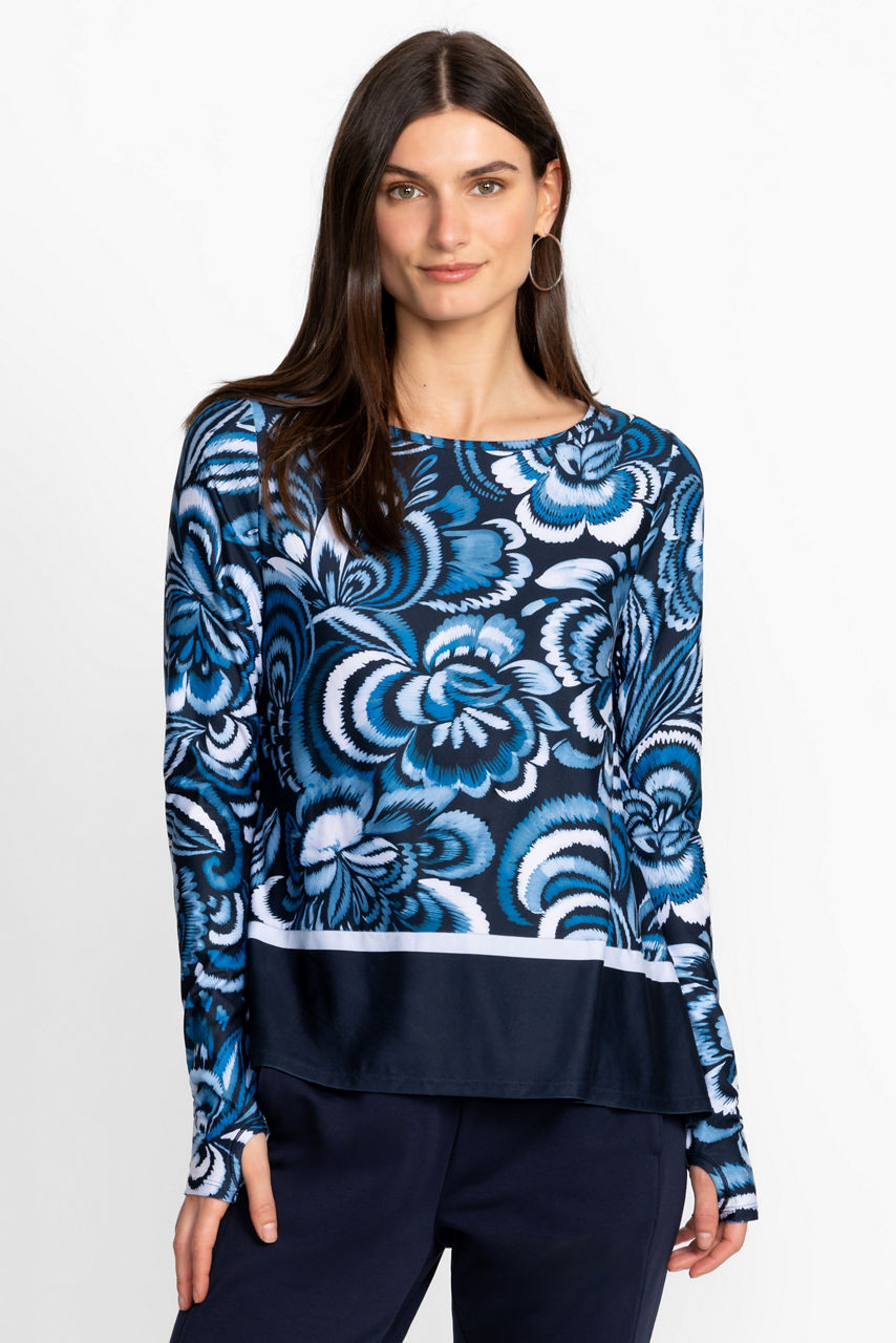 Light and breezy, the Bee Active Long Sleeve Handkerchief Hem Top seamlessly combines athleisure and elevated style. Featuring a scoop neckline and long sleeves with thumbholes, this flowing blouse is finished with side slits and a handkerchief hem with contrasting stripes. Pair with navy leggings and a coordinating sports bra for a sophisticated gym combination.