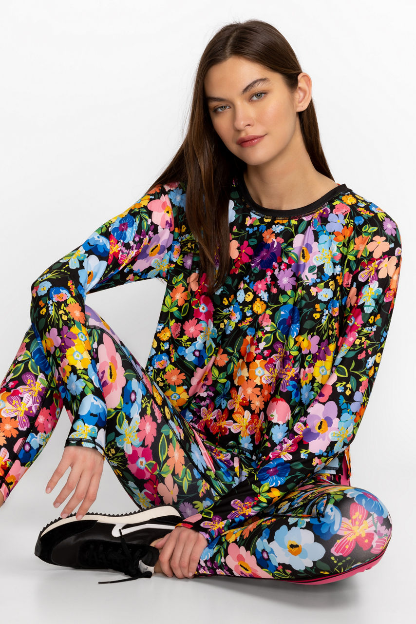 Adorned with bursting floral blooms, the Wild Bloom Long Sleeve Step Hem Tee offers an extra layer of warmth to your gym ensemble. Featuring a high rounded neckline and a fitted silhouette, this long sleeve tee is an easy layer that won't get in the way of your workout. Pair with classic leggings and a comfortable sports bra for a workout-ready look.