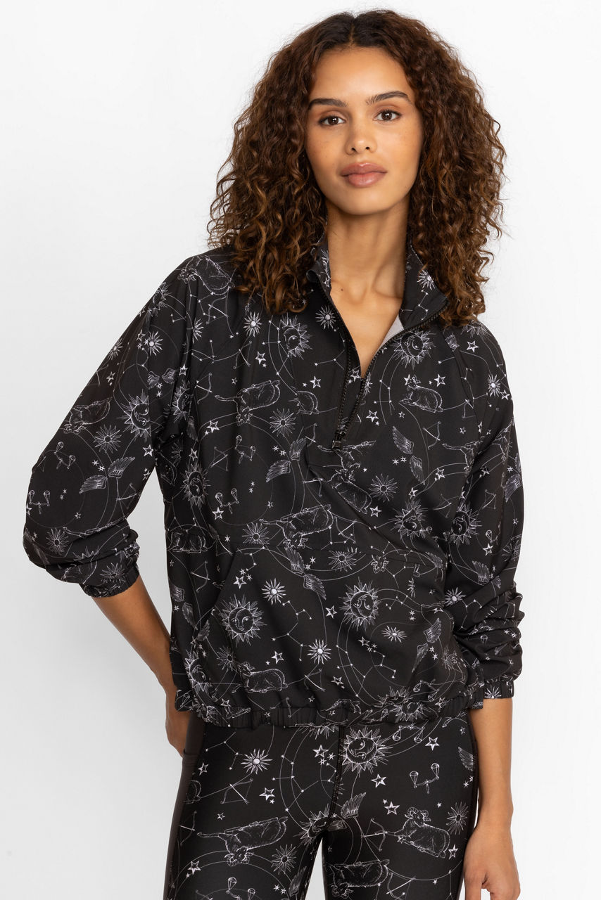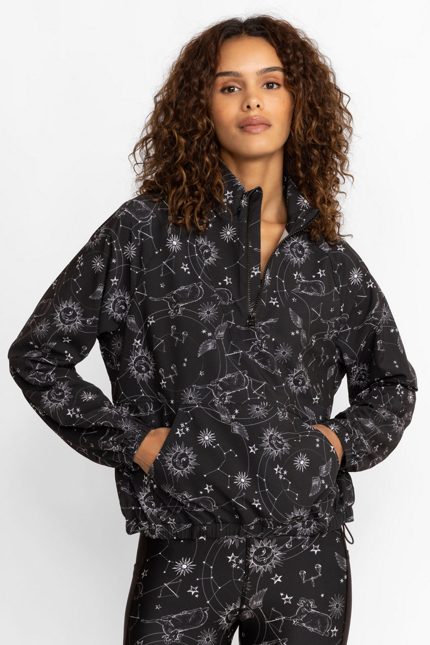Adopting a classic 90s silhouette, the Bijou Mock Neck Pullover Jacket adds a stylish twist to a practical outdoor favorite. This jacket is made from a recycled mix and features a 3/4 zip front, elastic cuffs and hem, a front kanga pocket, and a drawstring at hem. Wear this jacket with leggings and sneakers on your next weekend walk.