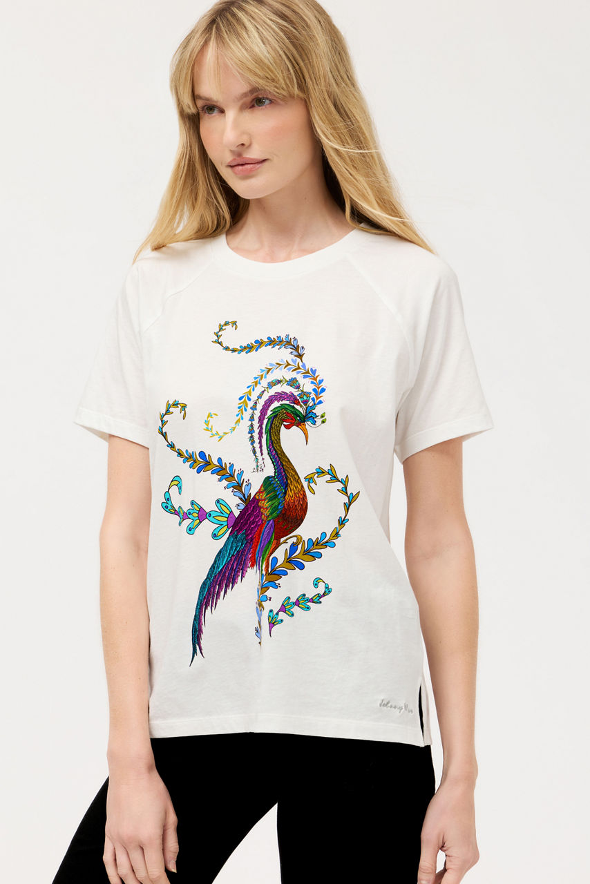Crafted from breathable 100% cotton, the Bee Active Raglan Graphic Tee features a vibrant flora-and-fauna printed graphic for a smooth, colorful finish. Designed with a classic crew neckline and relaxed raglan sleeves, this easy silhouette delivers effortless comfort with standout style. Pair with linen shorts and casual sandals for a resort-inspired ensemble.