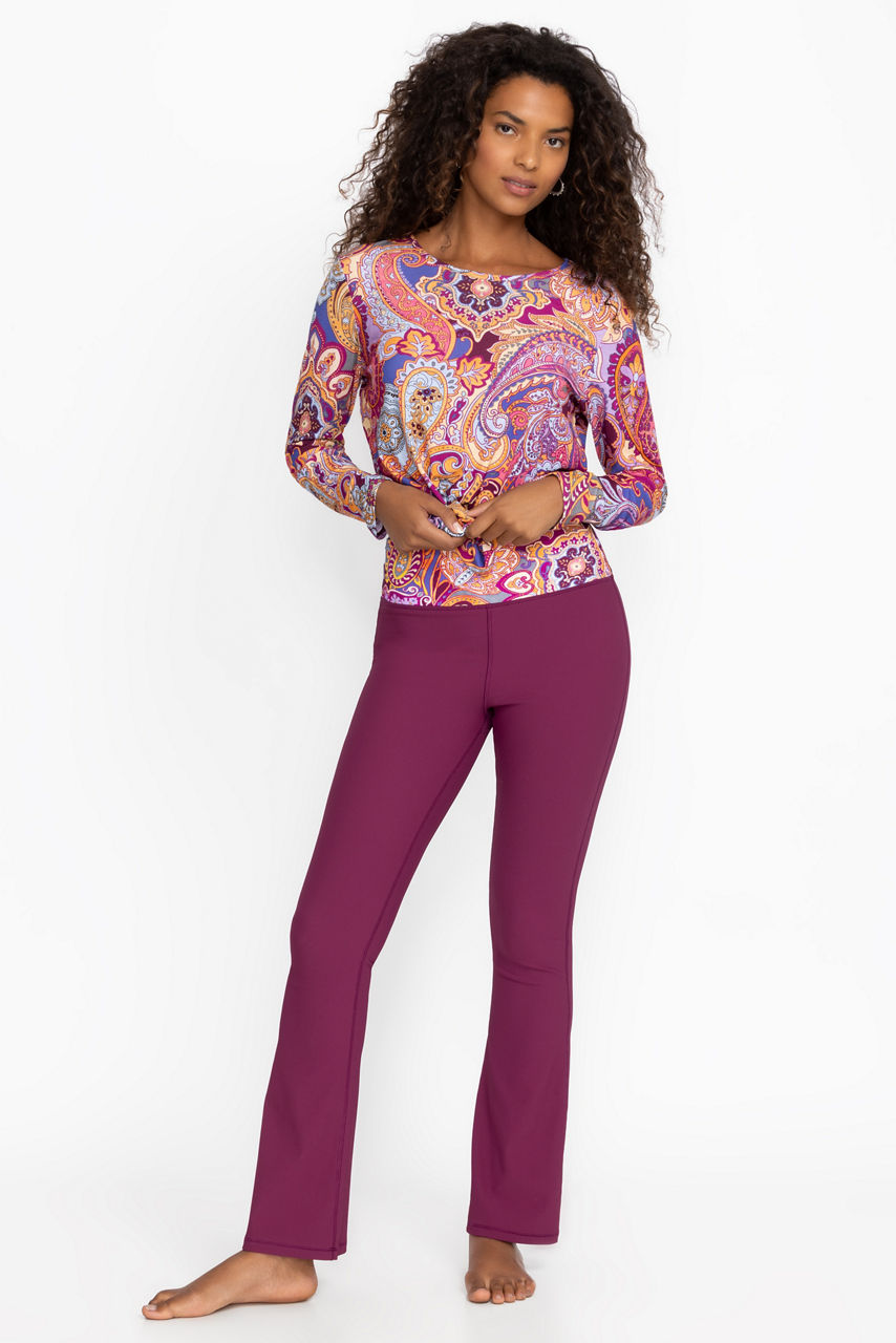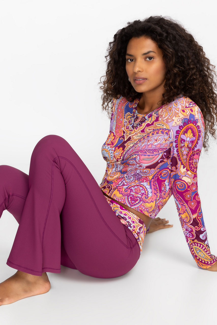 Crafted from a breathable stretch fabric, the Bee Active Ribbed Baby Bell Leggings are equal parts stylish and functional. Featuring a vibrant, multicolored elastic waistband, these ribbed leggings are washed in a rich violet color and finished with a slight bell-bottom hemline. Pair with a coordinating active top and athletic sneakers for a session at the gym.