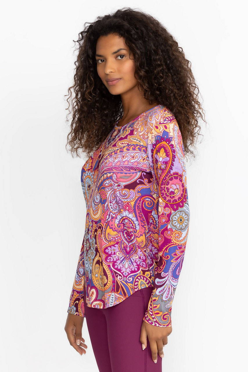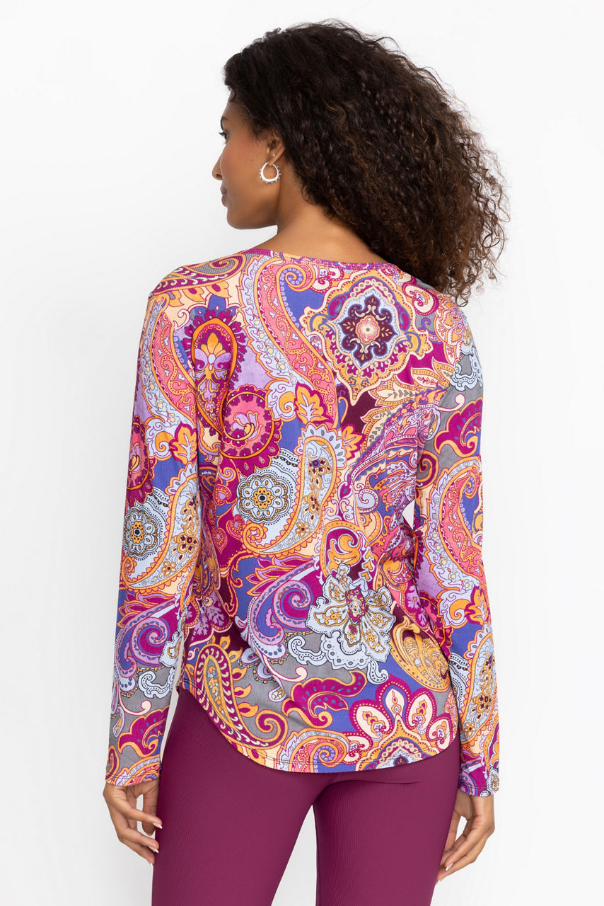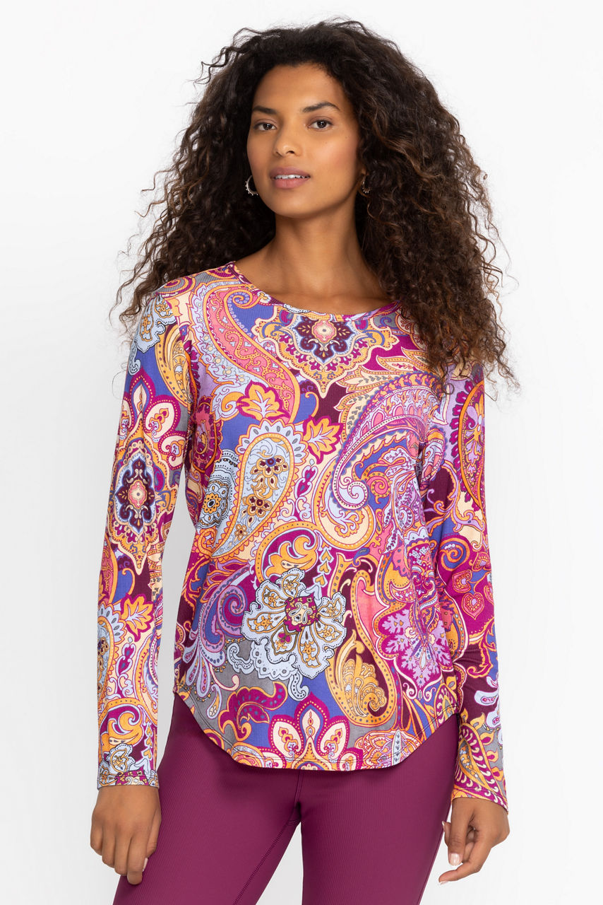 Crafted from a super-soft fabric with a hint of stretch, the Bee Active Ribbed Long Sleeve Tee is adorned with a vibrant paisley pattern. Featuring a crew neckline and fitted long sleeves, this vibrant top is finished with a curved hemline. Pair with the Bee Active Ribbed Baby Bell Leggings and athletic sneakers for a session at the gym.