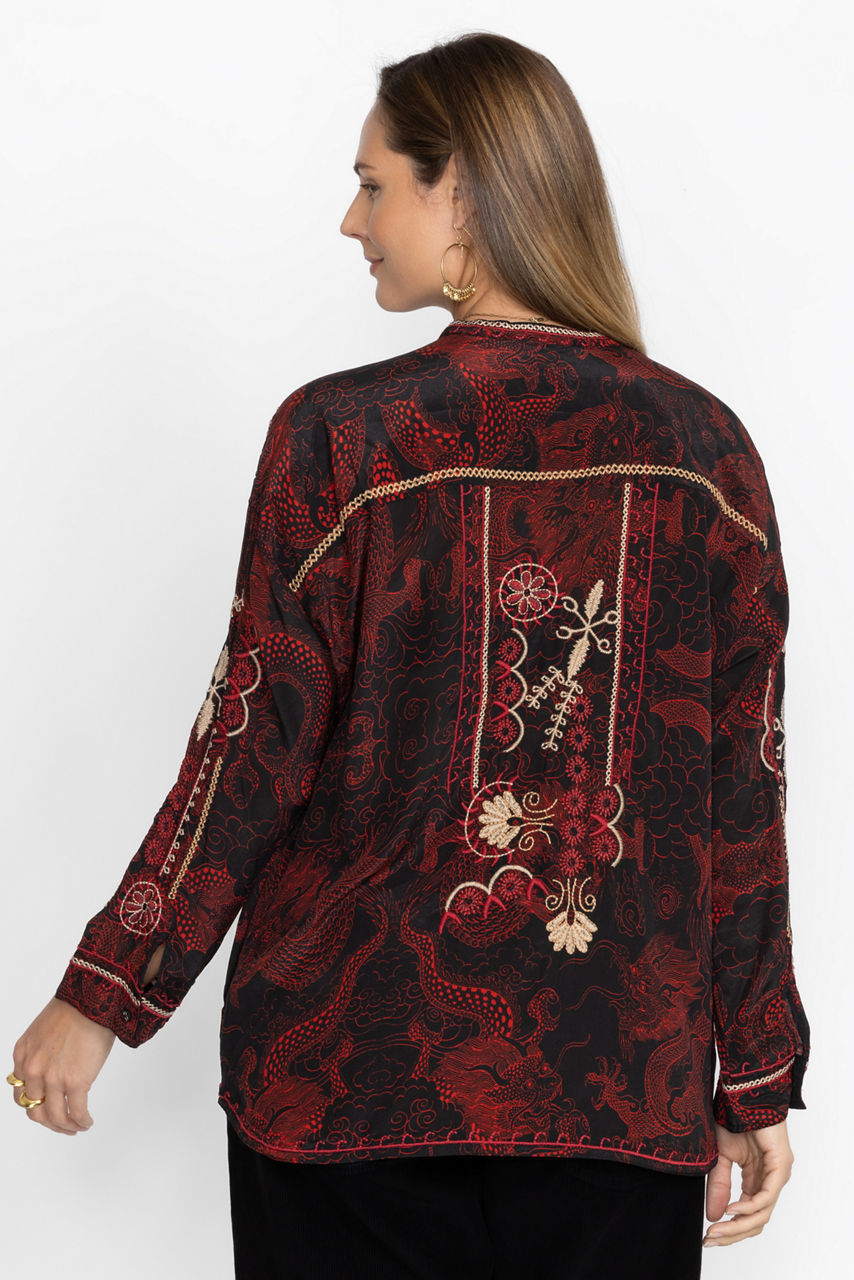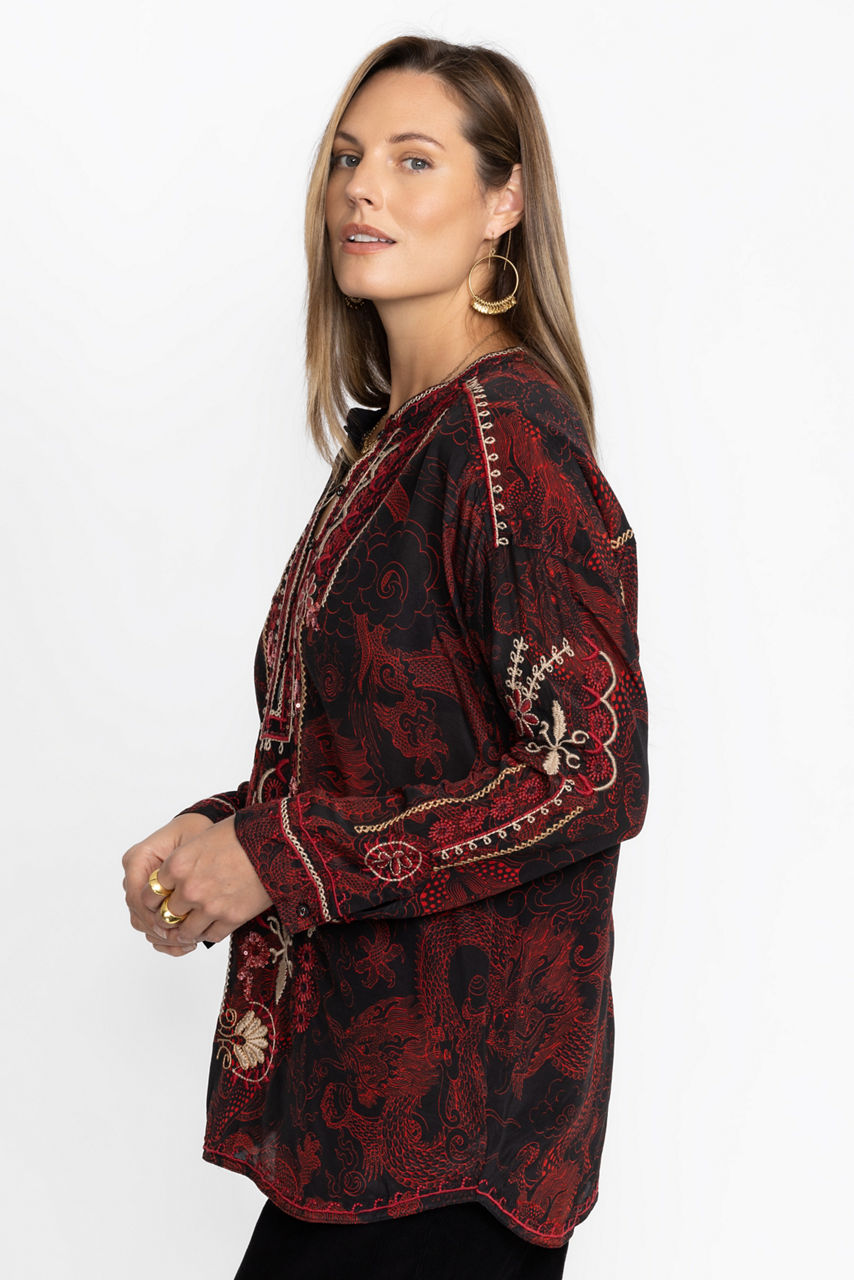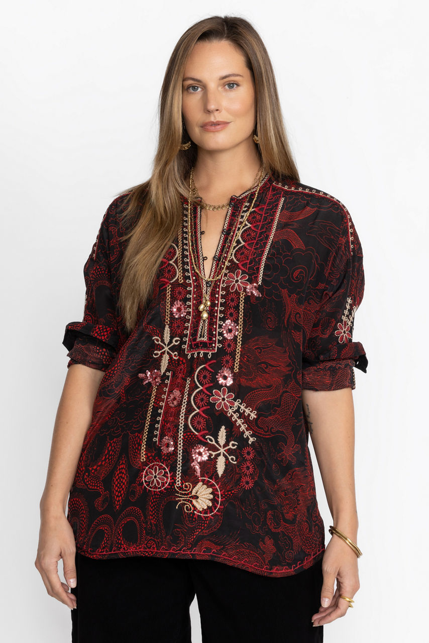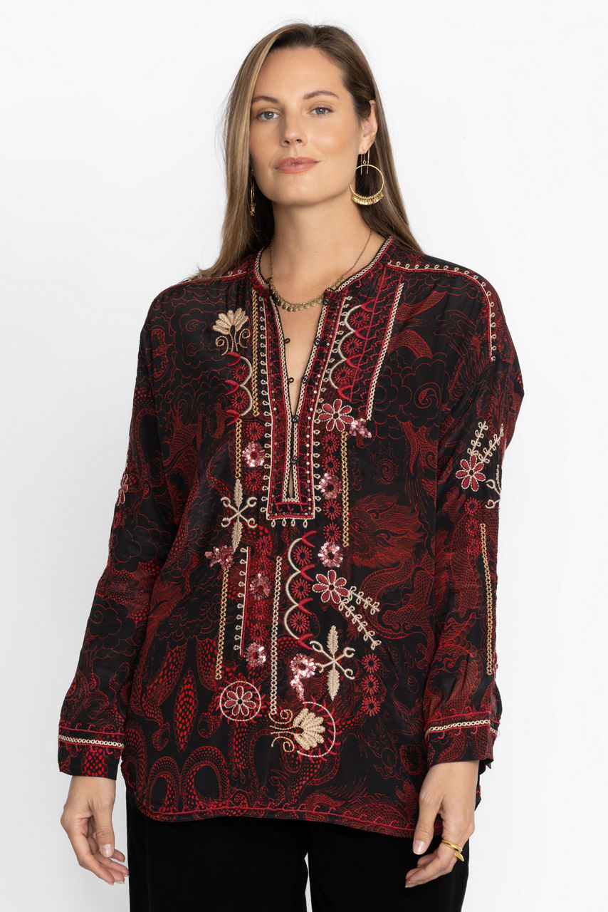 Ornately detailed to create an elevated style, the Belina Tunic Top offers an opulent addition to any wardrobe. Crafted from 100% silk and adorned with carefully placed embroidered images, this beautiful tunic features a fabric covered button-front and cuffs. Pair with flowing trousers and mule flats for a polished timeless look.